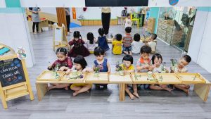 Mỗi bữa ăn tại trường được chuẩn bị và phục vụ trong không gian tinh tế, thoải mái, với sự trang trí cẩn thận để tạo ra một trải nghiệm ẩm thực tuyệt vời cho trẻ. Bên cạnh đó, việc thông báo thực đơn hàng tuần qua phần mềm Tomia giúp phụ huynh dễ dàng theo dõi và đảm bảo chế độ ăn uống đa dạng, cân đối cho con yêu của mình.