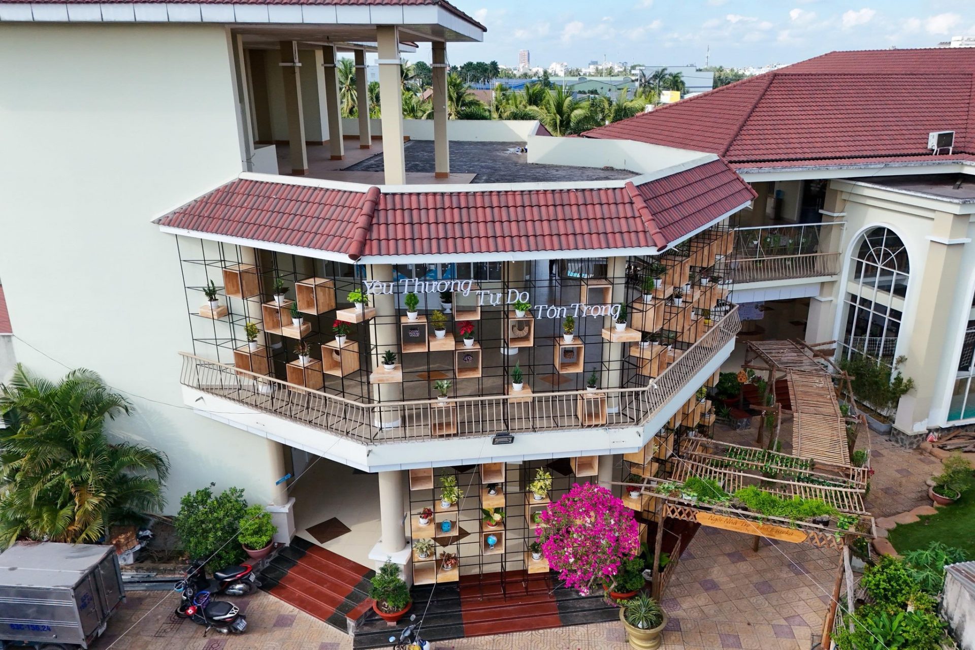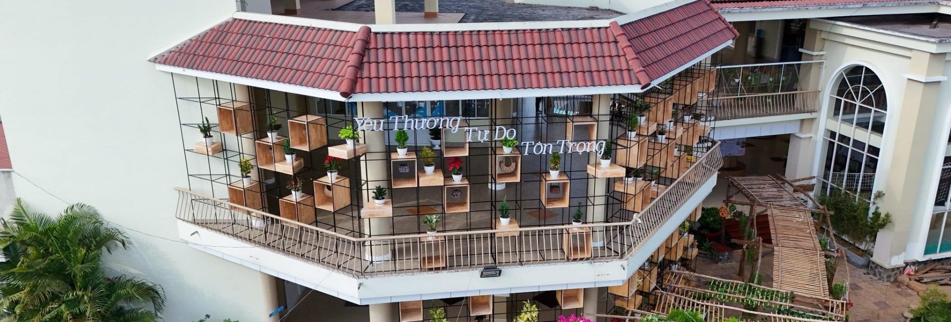 Không gian trường hơn 3000m2 với cây xanh bao phủ, có nhiều khu nông trại, vườn rau tạo điều kiện cho trẻ khám phá về thiên nhiên và động vật như thỏ, gà, chim bồ câu, dê v.v. Đồng thời, trường cũng được trang bị nhiều tiện ích như bể bơi, sân chơi ngoài trời, sân cát, hỗ trợ trẻ phát triển toàn diện về thể chất lẫn trí tuệ.