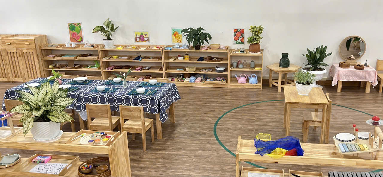 Chương trình học theo phương pháp giáo dục Montessori hướng trẻ đến sự độc lập, tự chủ, tự tin, trách nhiệm và hạnh phúc trong giai đoạn đầu đời. Phòng học được trang bị sàn gỗ và đầy đủ giáo cụ Montessori, tất cả đều được nhập khẩu từ Ấn Độ. Phụ huynh có thể yên tâm về chất lượng, vì gỗ được sử dụng không chứa chất chì gây hại cho sức khỏe của trẻ.