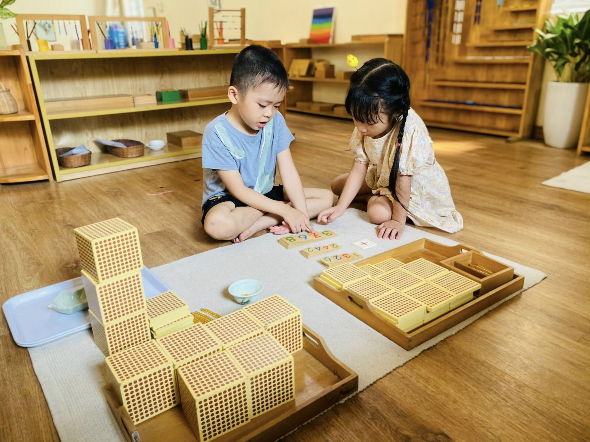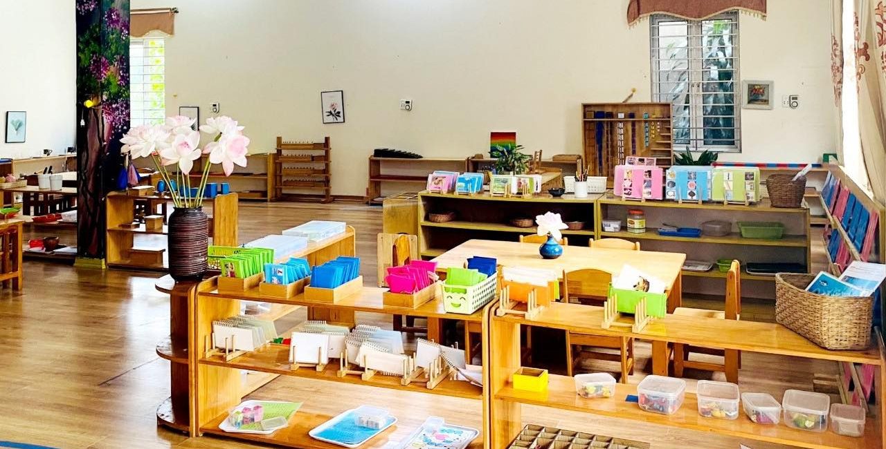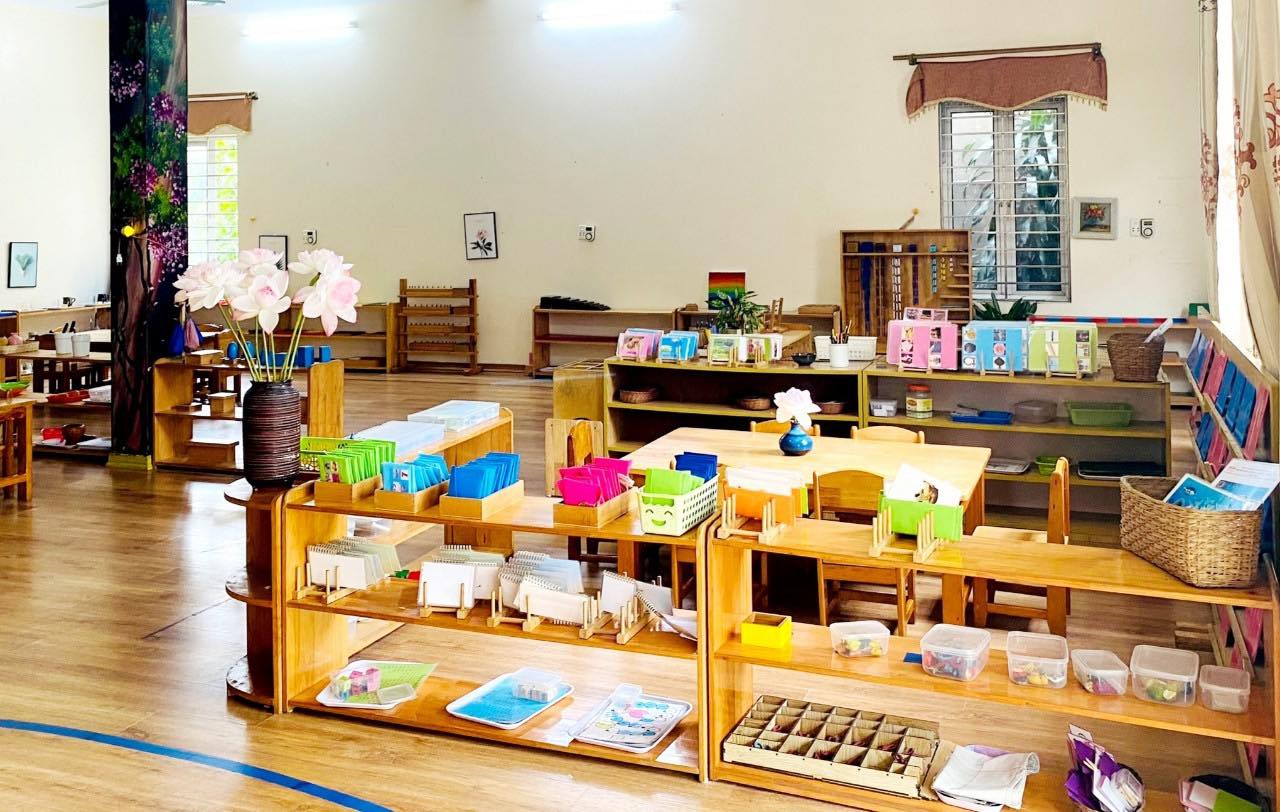 Sân chơi ngoại ô trải cỏ rộng lớn 150m2 là điểm nhấn khác biệt, với nhà gỗ, hố cát, xích đu, bập bênh và cây xanh, tạo ra không gian vận động và tương tác với thiên nhiên, khuyến khích sự sáng tạo và phát triển của trẻ. Đồ chơi gỗ và giáo cụ Montessori nhập khẩu chất lượng cao nhằm đảm bảo an toàn và kích thích sự tò mò của trẻ.