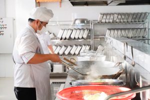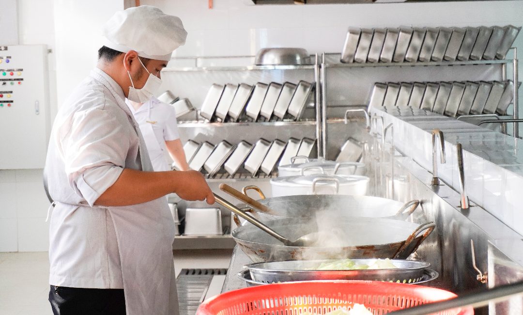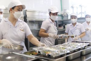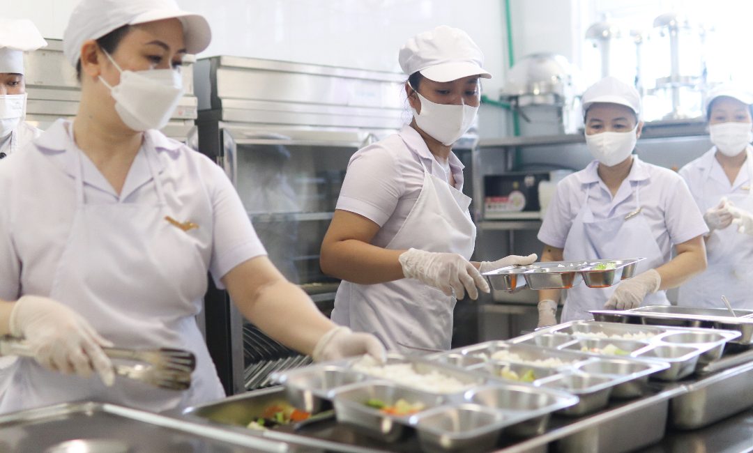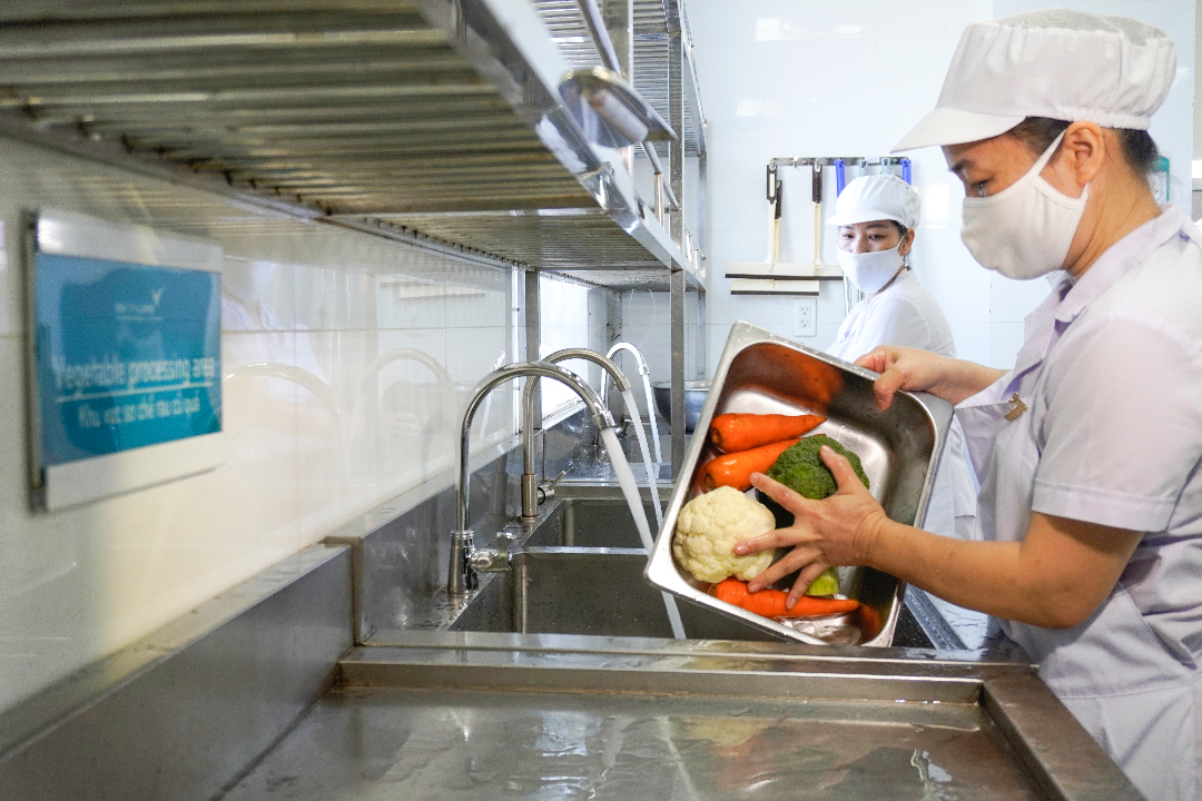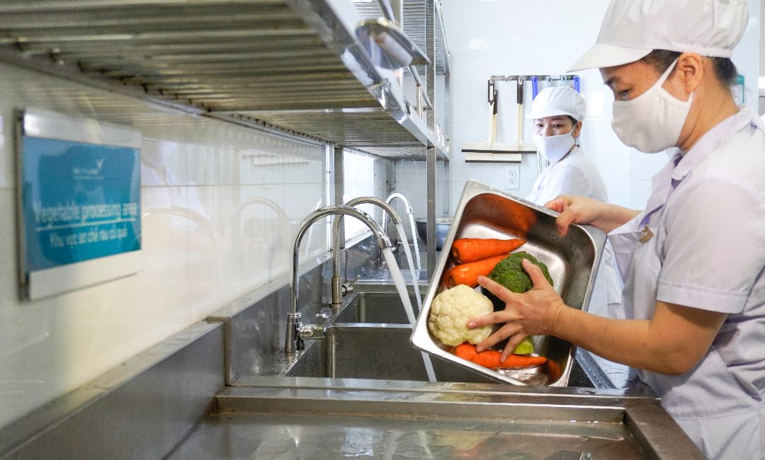 Thực phẩm sử dụng tại trường đảm bảo chuẩn VietGAP, nước uống đạt QCVN, đặc biệt tại cơ sở có vườn thực nghiệm cung cấp nguyên liệu sạch. Bữa ăn được phục vụ linh hoạt từ hai đến năm bữa mỗi ngày tùy theo độ tuổi, trong đó có một bữa buffet mỗi tháng. Quy trình chế biến theo chuẩn một chiều, thực phẩm lưu mẫu, dụng cụ ăn uống được khử khuẩn trước và sau khi sử dụng. Thực đơn đa dạng, cân bằng dinh dưỡng, đảm bảo phát triển thể chất và trí lực cho học sinh.