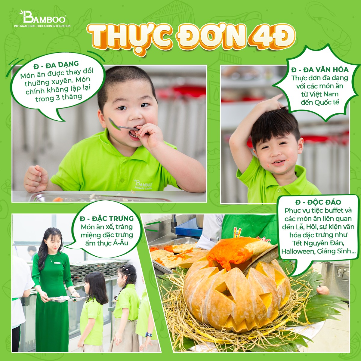 🌷Nhà trường xây dựng thực đơn dựa trên nhu cầu của học sinh về những bữa ăn được thay đổi thường xuyên, đa dạng nguồn dinh dưỡng và giúp tạo hứng thú hơn khi thưởng thức. Thực đơn 4D được phát triển dựa trên 4 tiêu chí, trực tiếp đáp ứng nhu cầu nêu trên từ các bạn học sinh.