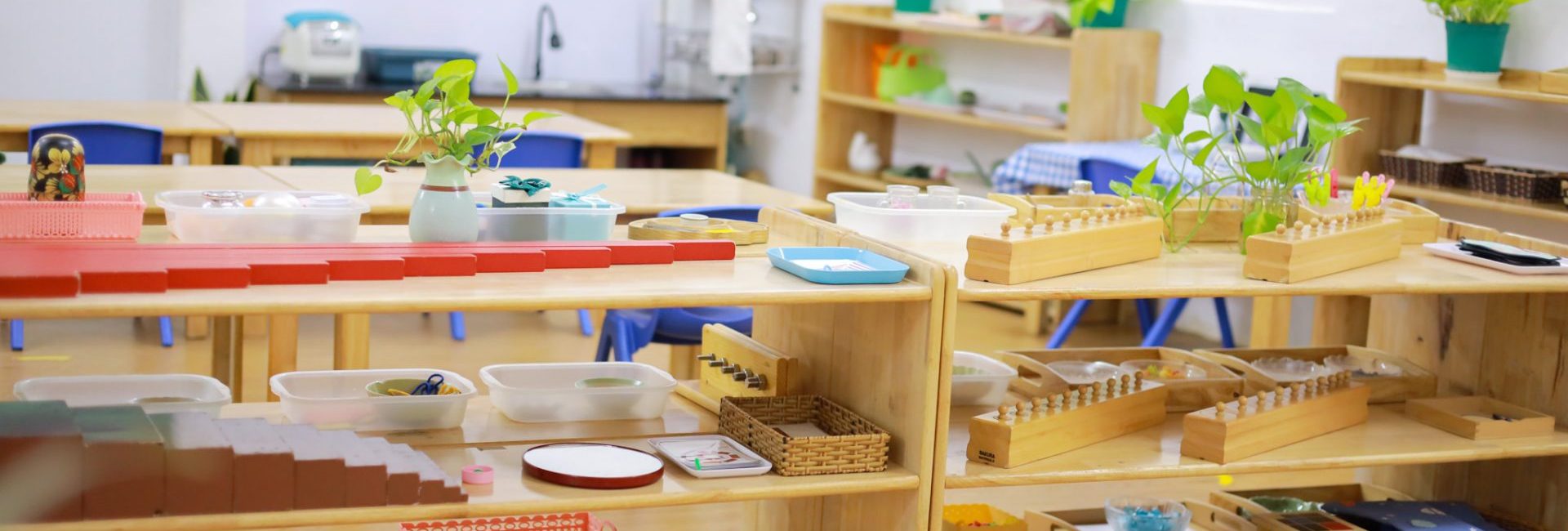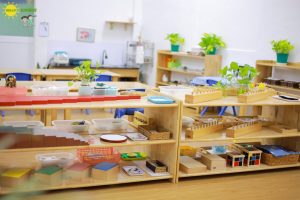 Lớp học sử dụng vật liệu tự nhiên có kích thước và độ khó hợp lý, an toàn cho trẻ. Đồ dùng được sắp xếp gọn gàng, sạch sẽ, đảm bảo yếu tố thẩm mỹ với tông màu nhẹ nhàng, không gian hài hòa. Môi trường học tập luôn được thầy cô và trẻ chăm sóc mỗi ngày.