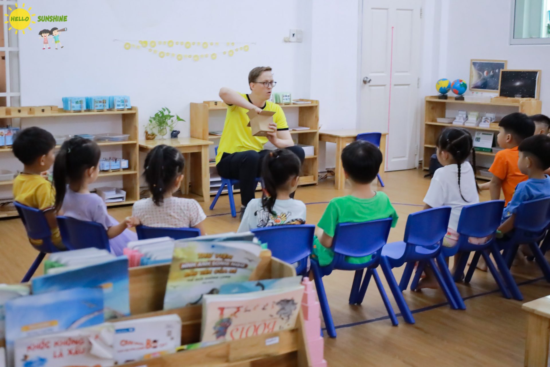 Chương trình Tiếng Anh tại Hello Sunshine giúp trẻ thẩm thấu ngôn ngữ tự nhiên qua việc tương tác hàng ngày với giáo viên bản ngữ. Trẻ học thông qua các hoạt động vui chơi, ca hát, kể chuyện, phát triển đầy đủ các kỹ năng nghe, nói, đọc, viết. Môi trường song ngữ khuyến khích trẻ tự tin giao tiếp, tạo nền tảng vững chắc và sự yêu thích đối với Tiếng Anh.