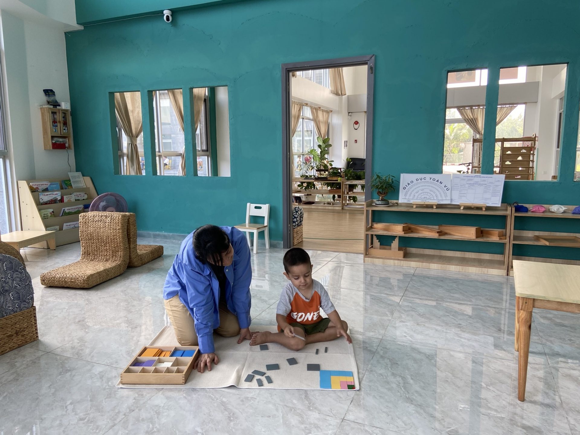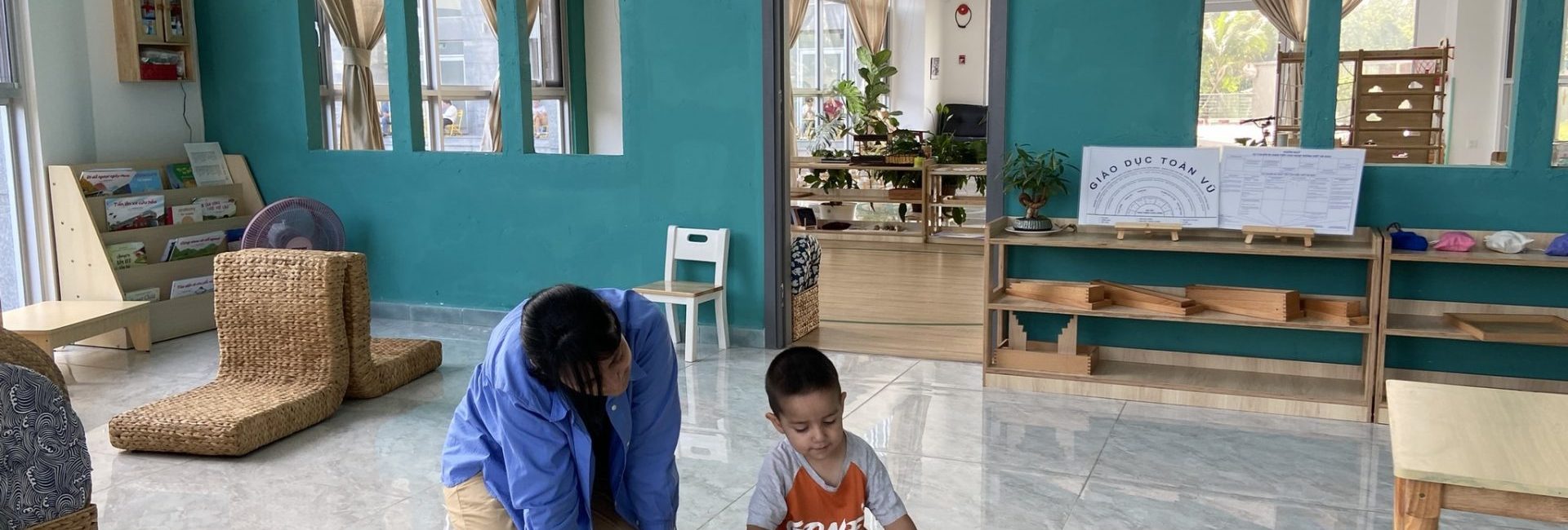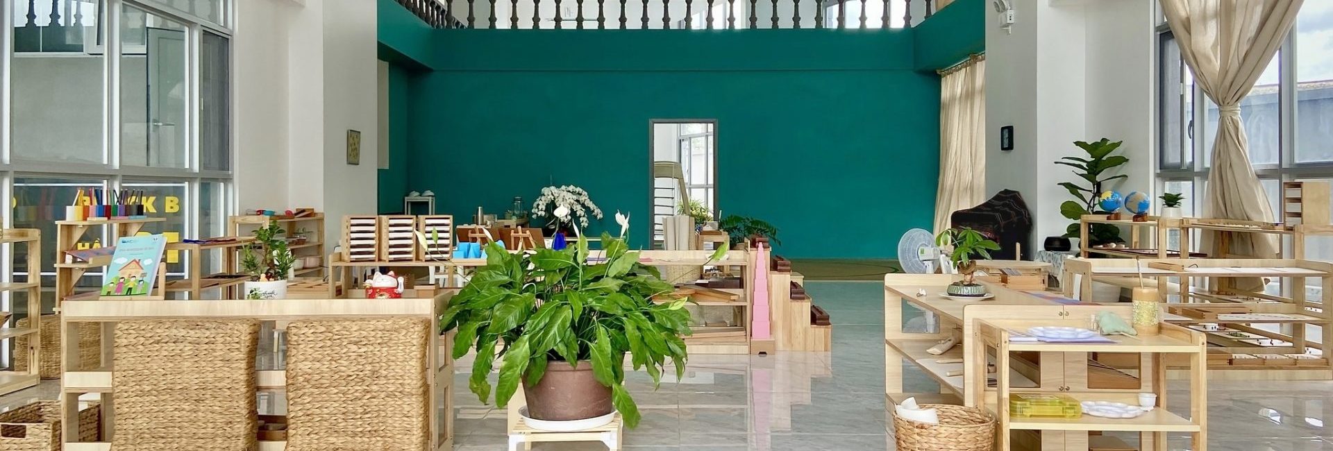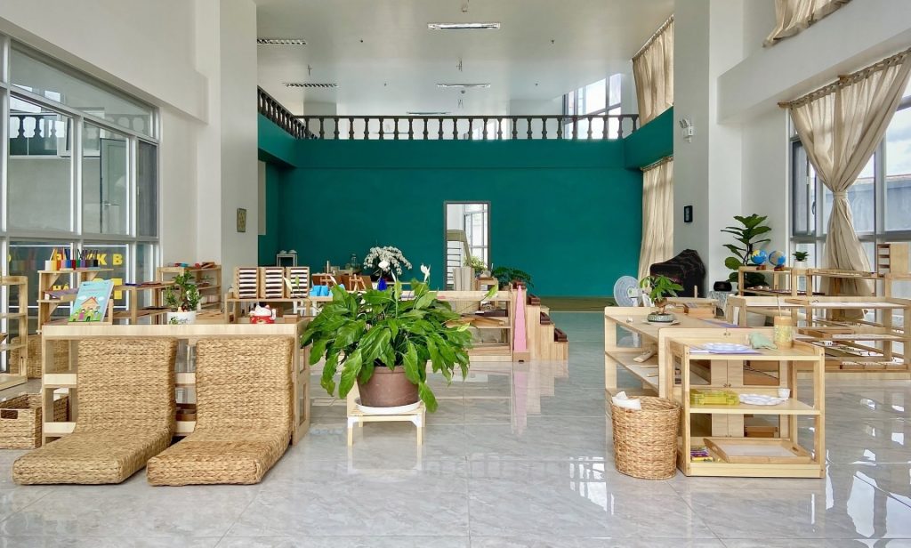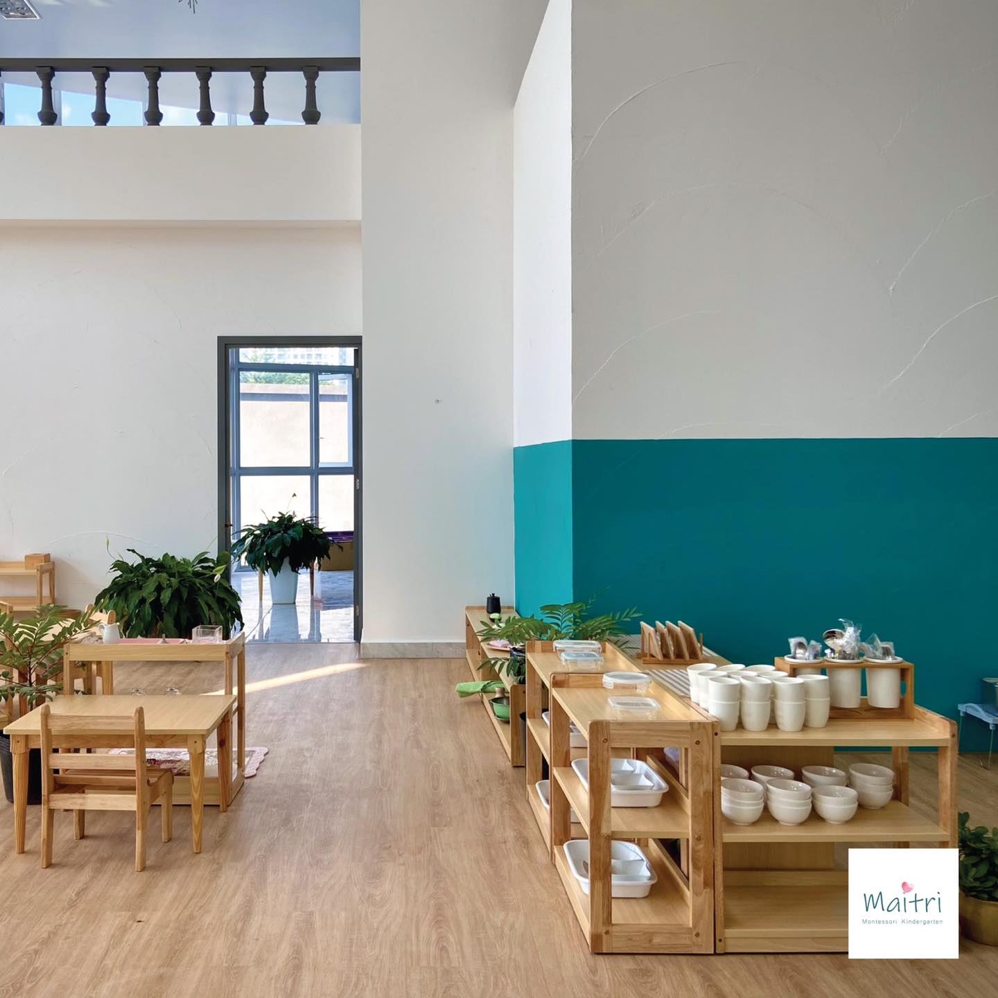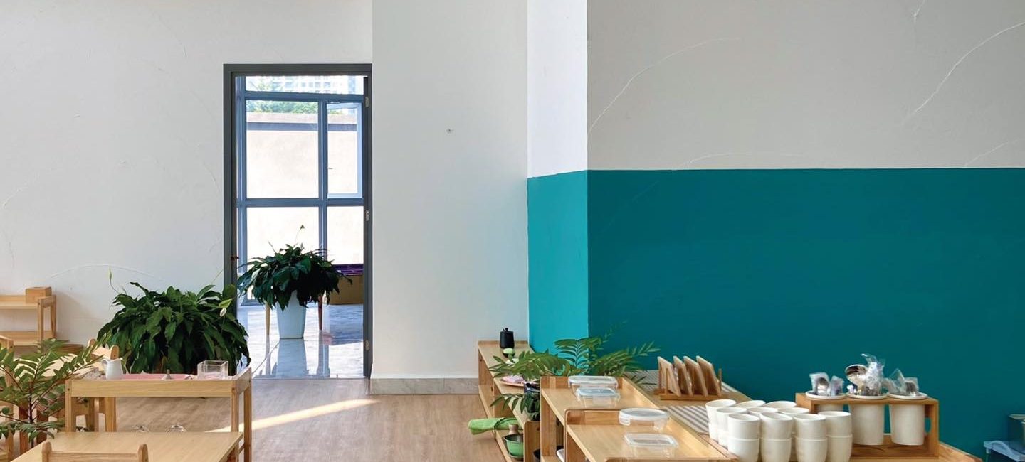 Mầm Non Maitri Montessori Kindergarten – An Khánh không chỉ là nơi học tập mà còn là một môi trường khám phá thú vị cho trẻ. Với sự chú trọng đặc biệt đến không gian lớp học, mỗi phòng học được thiết kế tạo cảm giác hứng khởi và thoải mái cho các bạn nhỏ. Maitri đặt lớp học ở vị trí rất lý tưởng, nơi có cửa sổ hoặc mảng kính hỗ trợ trẻ có thể quan sát môi trường bên ngoài một cách tự nhiên từ đó xây dựng kỹ năng quan sát và kết nối với thế giới xung quanh. Các cửa sổ nhìn ra đường phố hoặc sân trường với hàng rào thưa tạo nên không gian mở, thuận lợi cho sự tương tác và giao lưu giữa bên trong và bên ngoài trường.