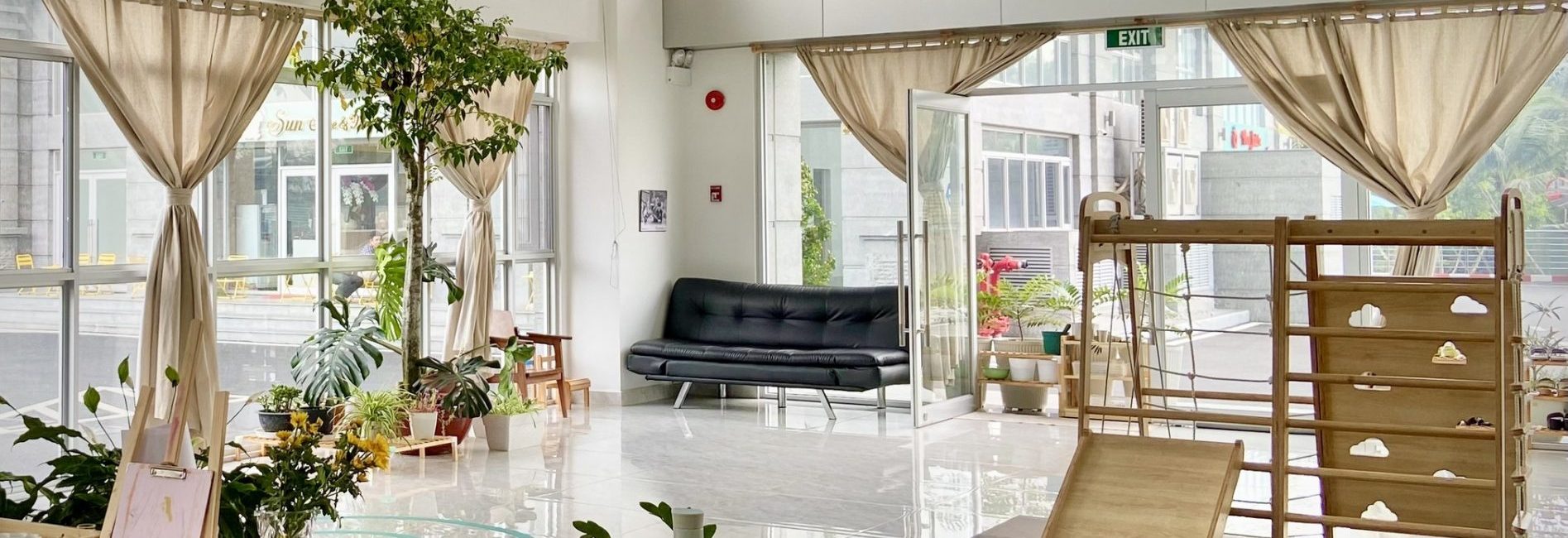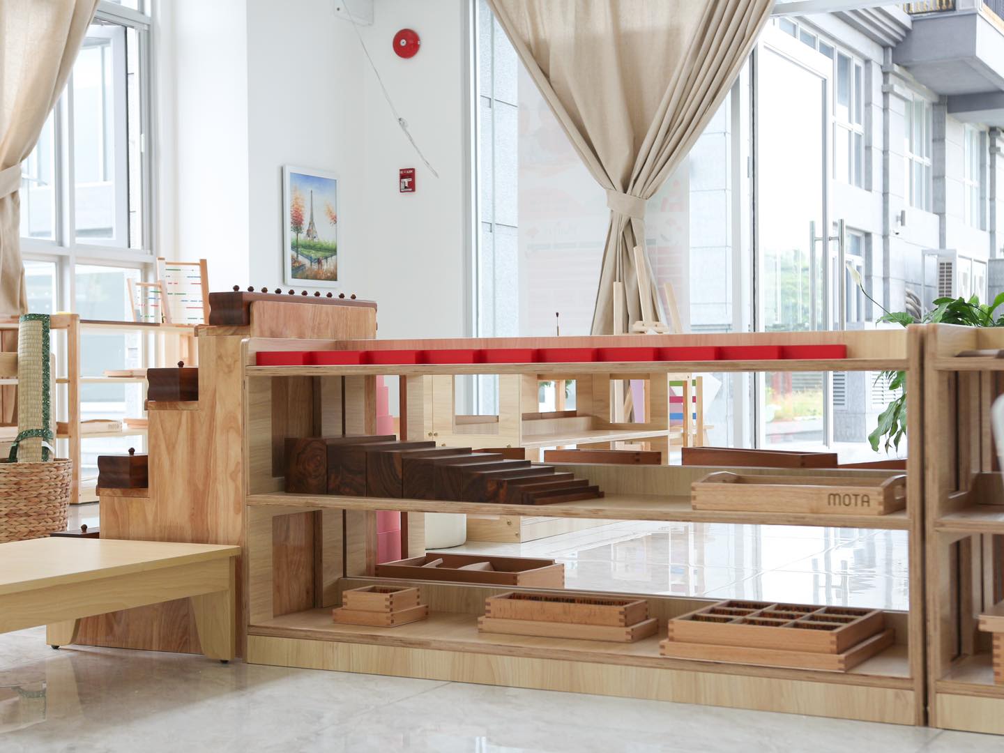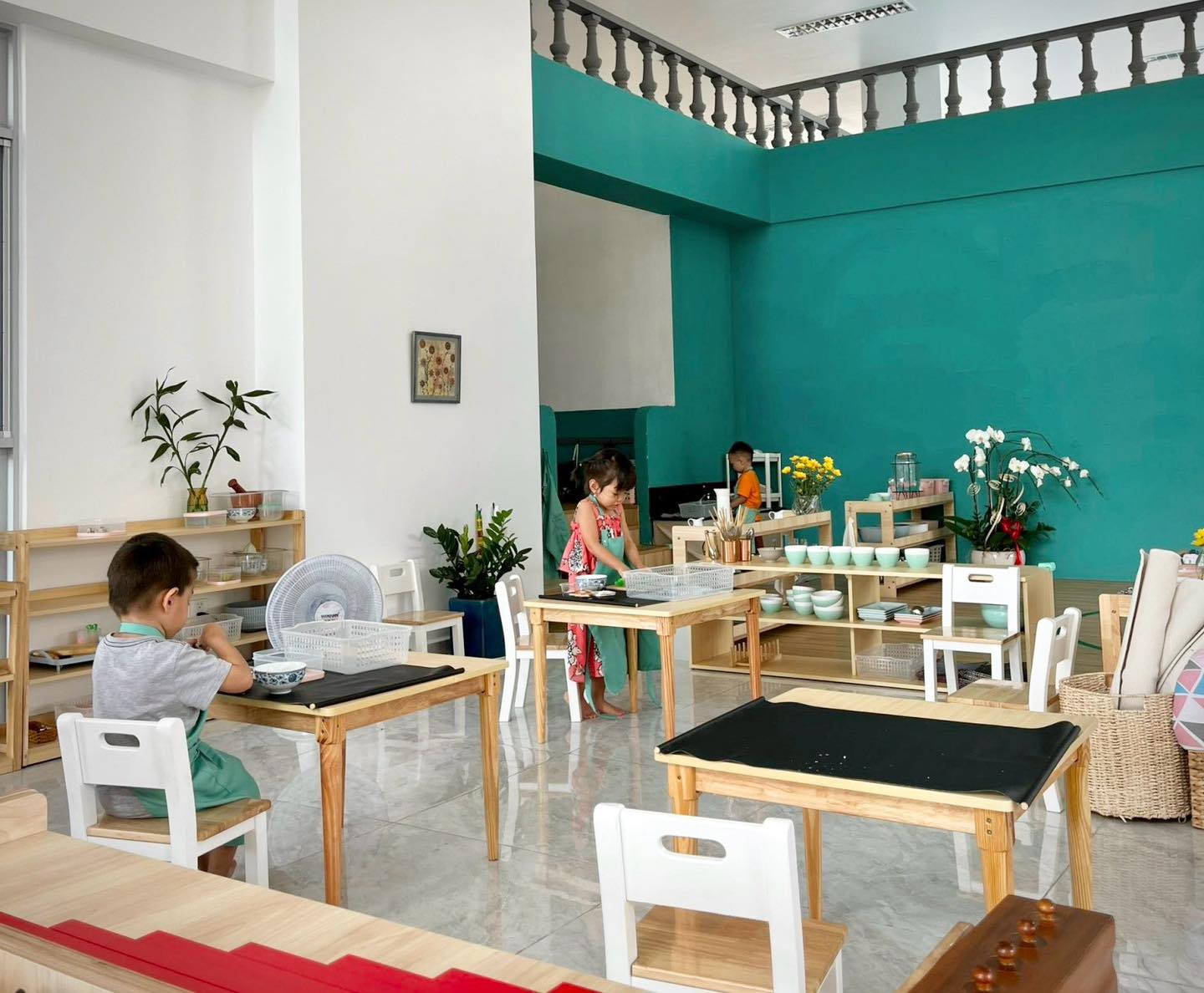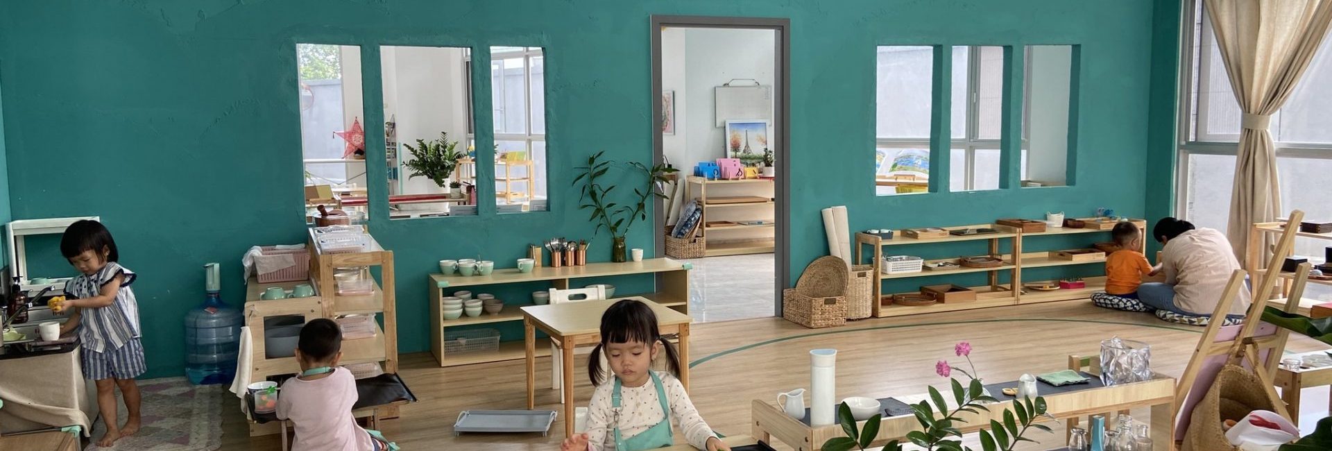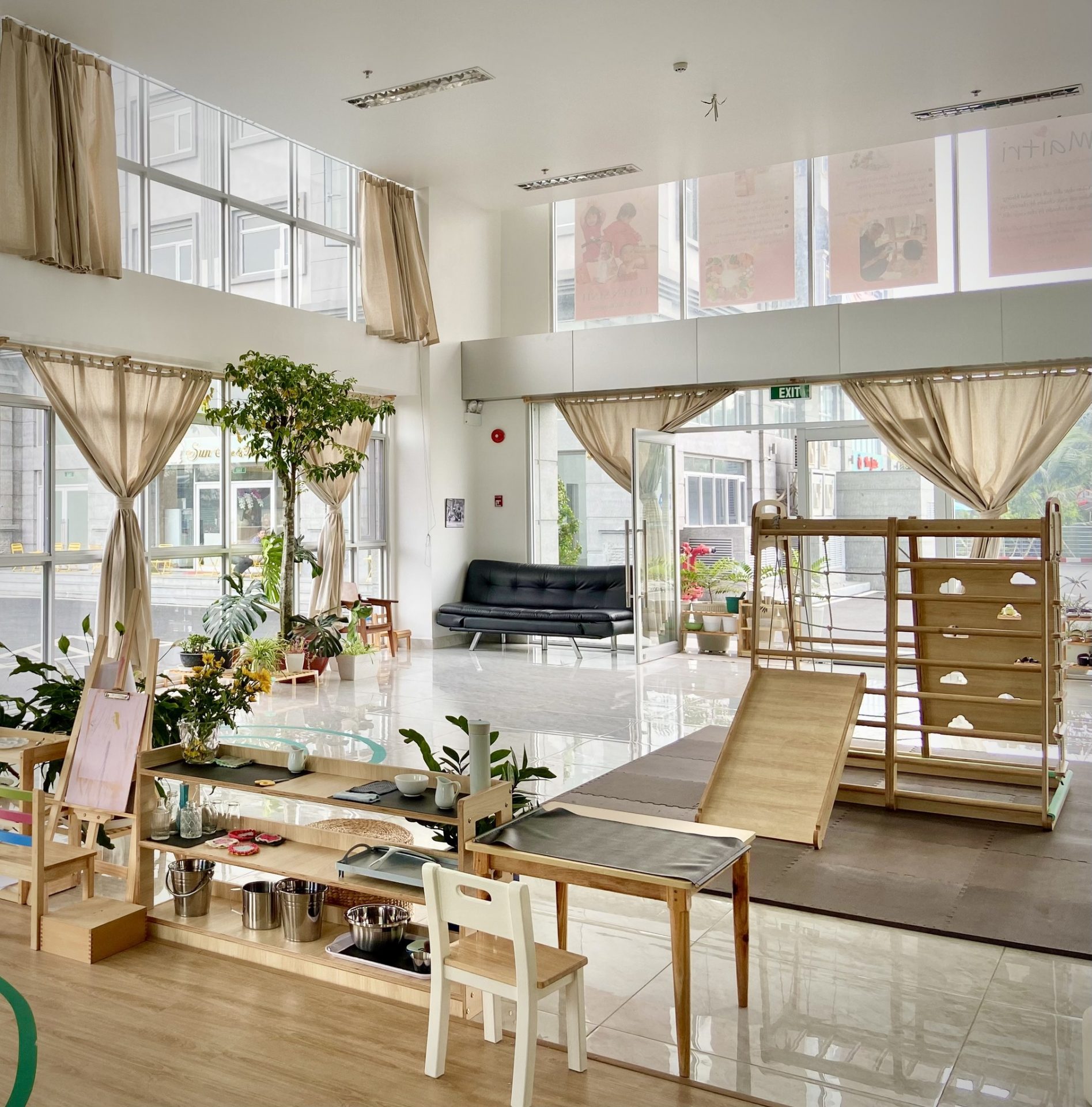 Mầm Non Maitri Montessori Kindergarten – An Khánh không chỉ là nơi học tập mà còn là một môi trường khám phá thú vị cho trẻ. Với sự chú trọng đặc biệt đến không gian lớp học, mỗi phòng học được thiết kế tạo cảm giác hứng khởi và thoải mái cho các bạn nhỏ. Maitri đặt lớp học ở vị trí rất lý tưởng, nơi có cửa sổ hoặc mảng kính hỗ trợ trẻ có thể quan sát môi trường bên ngoài một cách tự nhiên từ đó xây dựng kỹ năng quan sát và kết nối với thế giới xung quanh. Các cửa sổ nhìn ra đường phố hoặc sân trường với hàng rào thưa tạo nên không gian mở, thuận lợi cho sự tương tác và giao lưu giữa bên trong và bên ngoài trường.