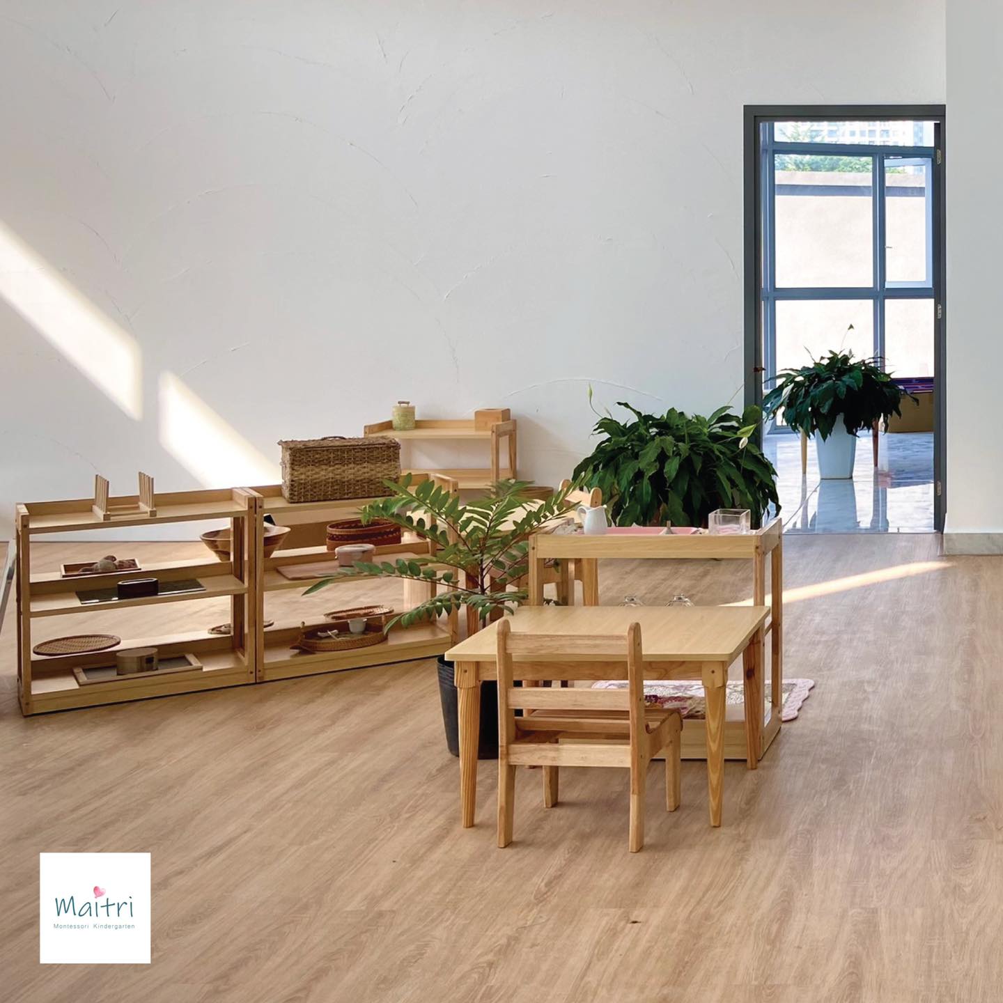 Maitri sử dụng hệ thống giáo cụ Montessori được bày trí ngăn nắp và sắp xếp hợp lý trong từng phòng học. Chiều cao của bàn ghế và giá kệ được điều chỉnh phù hợp, khuyến khích trẻ tự lập trong mọi hoạt động mà không cần sự giúp đỡ của người lớn. Khu vực sân chơi cũng được trang bị đồ chơi vận động đa dạng như xích đu, cầu trượt, tạo cơ hội cho trẻ phát triển vận động toàn diện và khám phá sự linh hoạt của cơ thể.