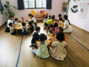 Bữa ăn tại Trường Mầm Non AChi vừa là thời điểm cung cấp chất dinh dưỡng vừa là tiết học về sự tự lập và trách nhiệm cho các bạn nhỏ. Trong không khí thoải mái và vui vẻ, trẻ được khuyến khích thể hiện sự tự chủ trong việc tự phục vụ, từ việc trải thảm ăn, lấy khăn ăn, đến việc chọn lựa thức ăn theo khẩu phần đã được chuẩn bị sẵn.