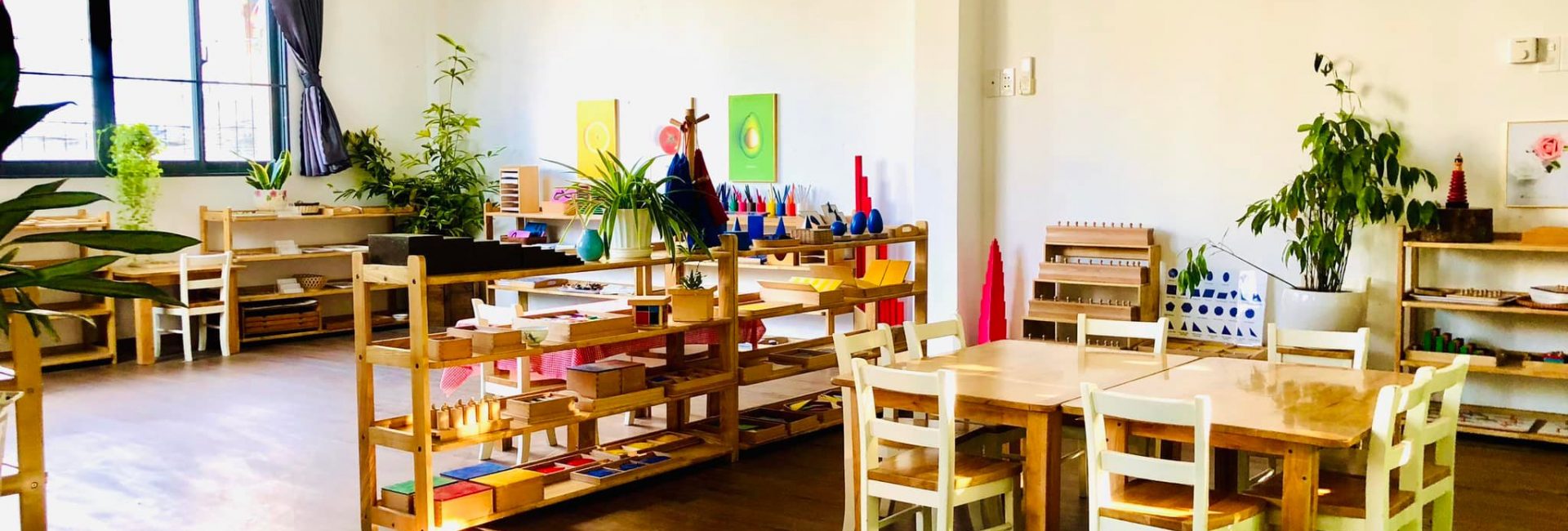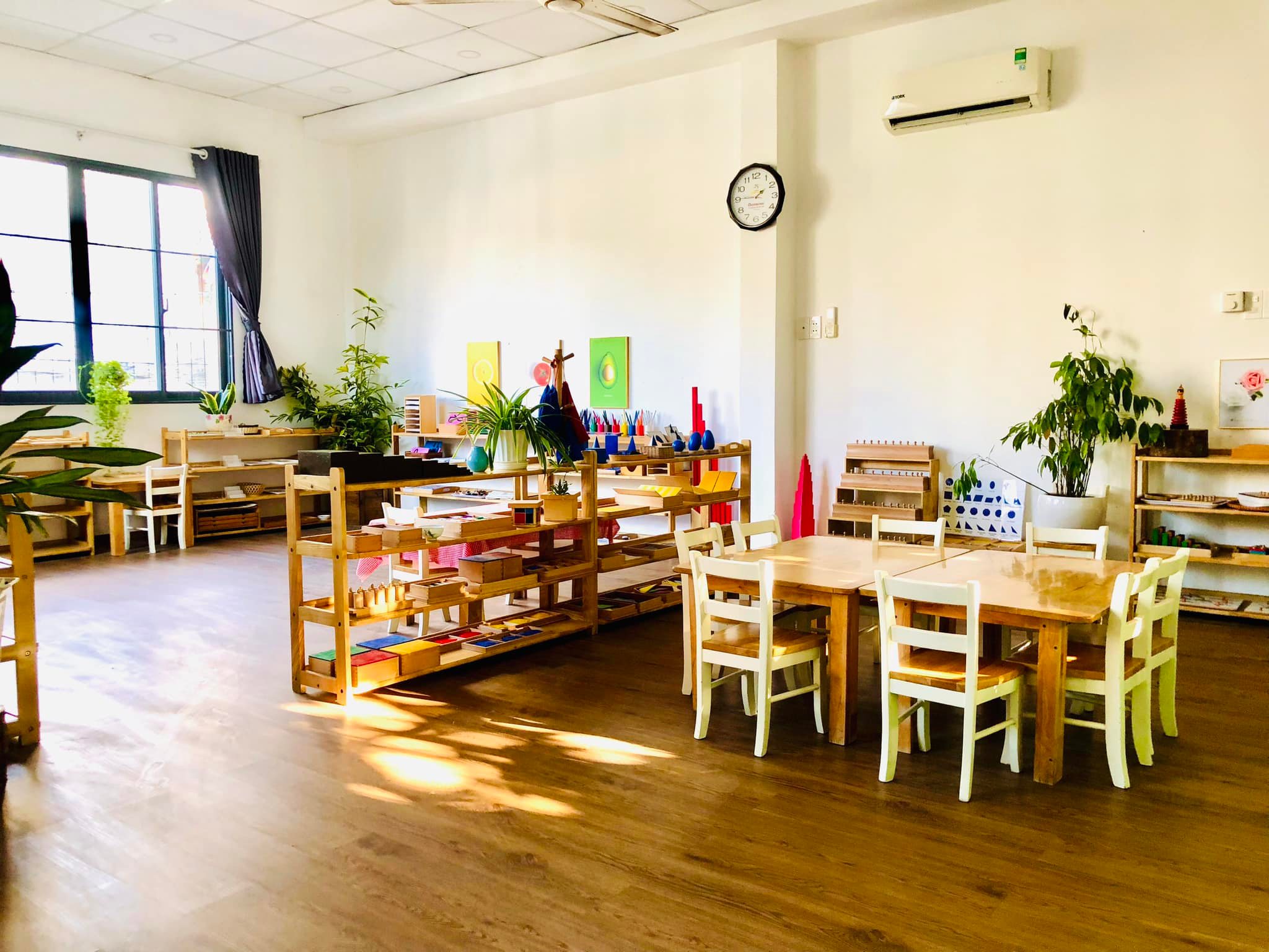Nằm trong khuôn viên trường là 5 phòng học có diện tích trung bình từ 60-80m2, được trang bị giáo cụ học tập bằng gỗ thân thiện, an toàn và được thiết kế phù hợp với hoạt động của trẻ nhỏ. Mỗi phòng học là một không gian tận dụng tối đa ánh sáng tự nhiên và không khí trong lành.