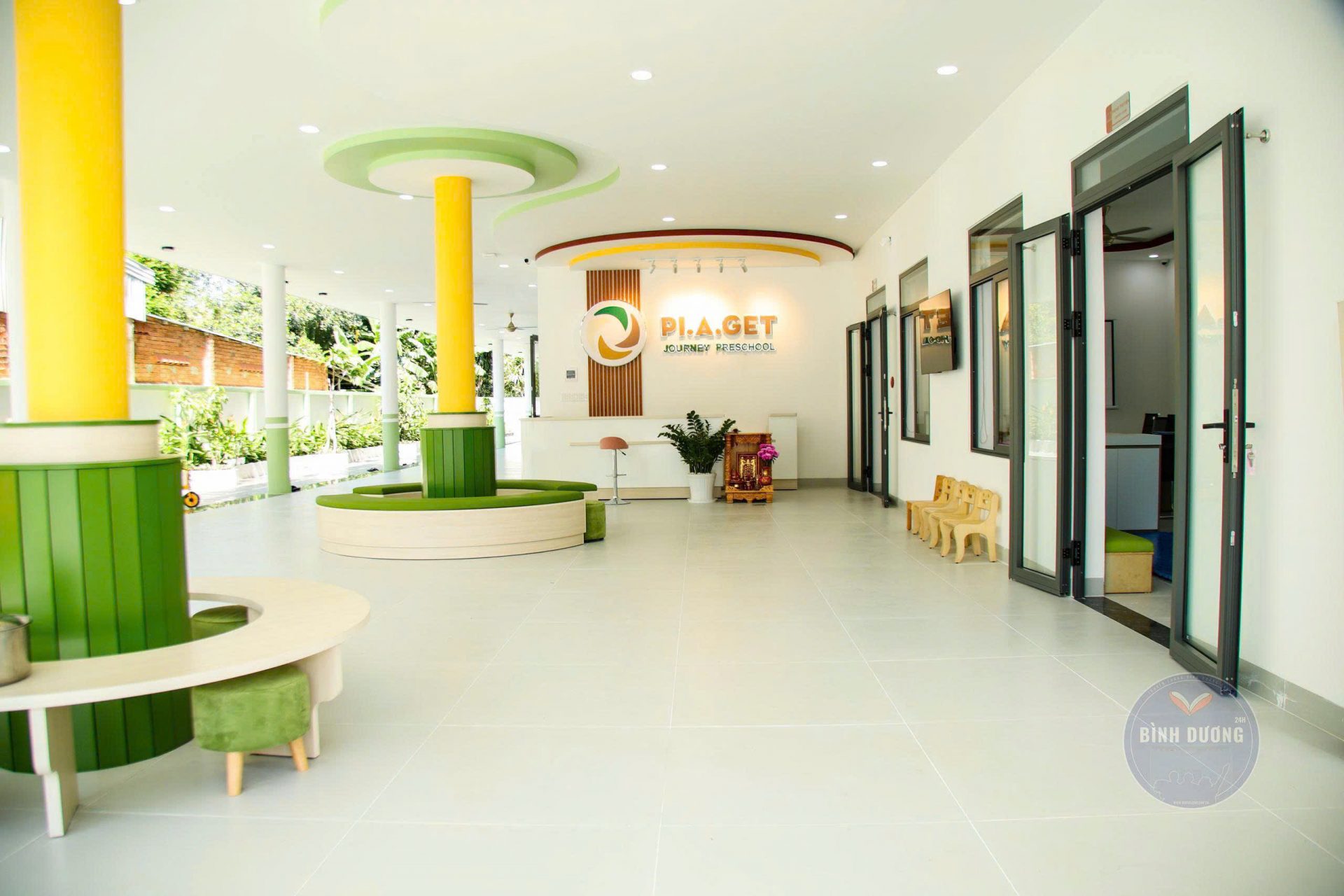 Mầm non Hành Trình Piaget được đầu tư cơ sở vật chất hiện đại, an toàn và thân thiện với trẻ. Phòng học thoáng mát, tràn ánh sáng tự nhiên, học cụ uy tín từ nhà MOTA KIDS, được bố trí theo từng độ tuổi tạo điều kiện cho trẻ khám phá độc lập. Bên cạnh đó, nhà trường còn chú trọng đầu tư hệ thống sân chơi ngoài trời đa năng, sân chơi trong nhà an toàn và hồ bơi mini nơi trẻ được vui đùa, rèn luyện thể chất một cách tự nhiên. Không gian thư viện thân thiện với nhiều đầu sách phong phú tạo thói quen đọc ngay từ những năm đầu đời.