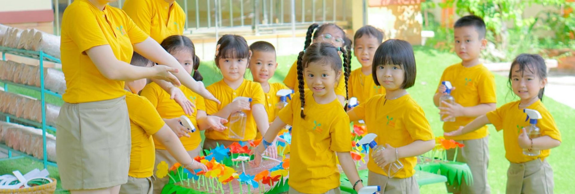 - Những khu vườn nhỏ được phủ đầy cây xanh và hoa cỏ, khuôn viên trường luôn tươi mát rực rỡ. Các loài hoa nở rộ, khoe sắc màu, không chỉ làm đẹp cảnh quan mà còn giúp các bé học cách yêu thương và chăm sóc thiên nhiên.