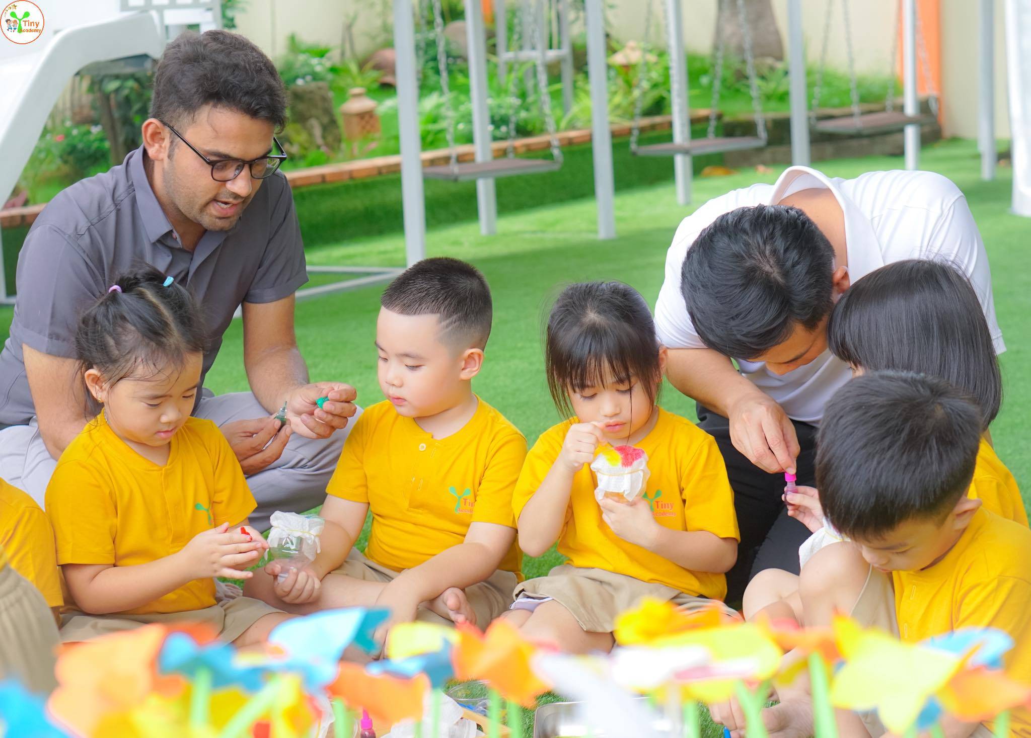 Chương trình tiếng Anh hàng ngày với giáo viên bản ngữ: Trẻ được tiếp xúc với tiếng Anh thông qua các hoạt động vui học, bài hát và giao tiếp tự nhiên với giáo viên bản ngữ. Điều này giúp trẻ làm quen với ngôn ngữ thứ hai một cách hiệu quả, tự tin hơn trong việc sử dụng tiếng Anh.