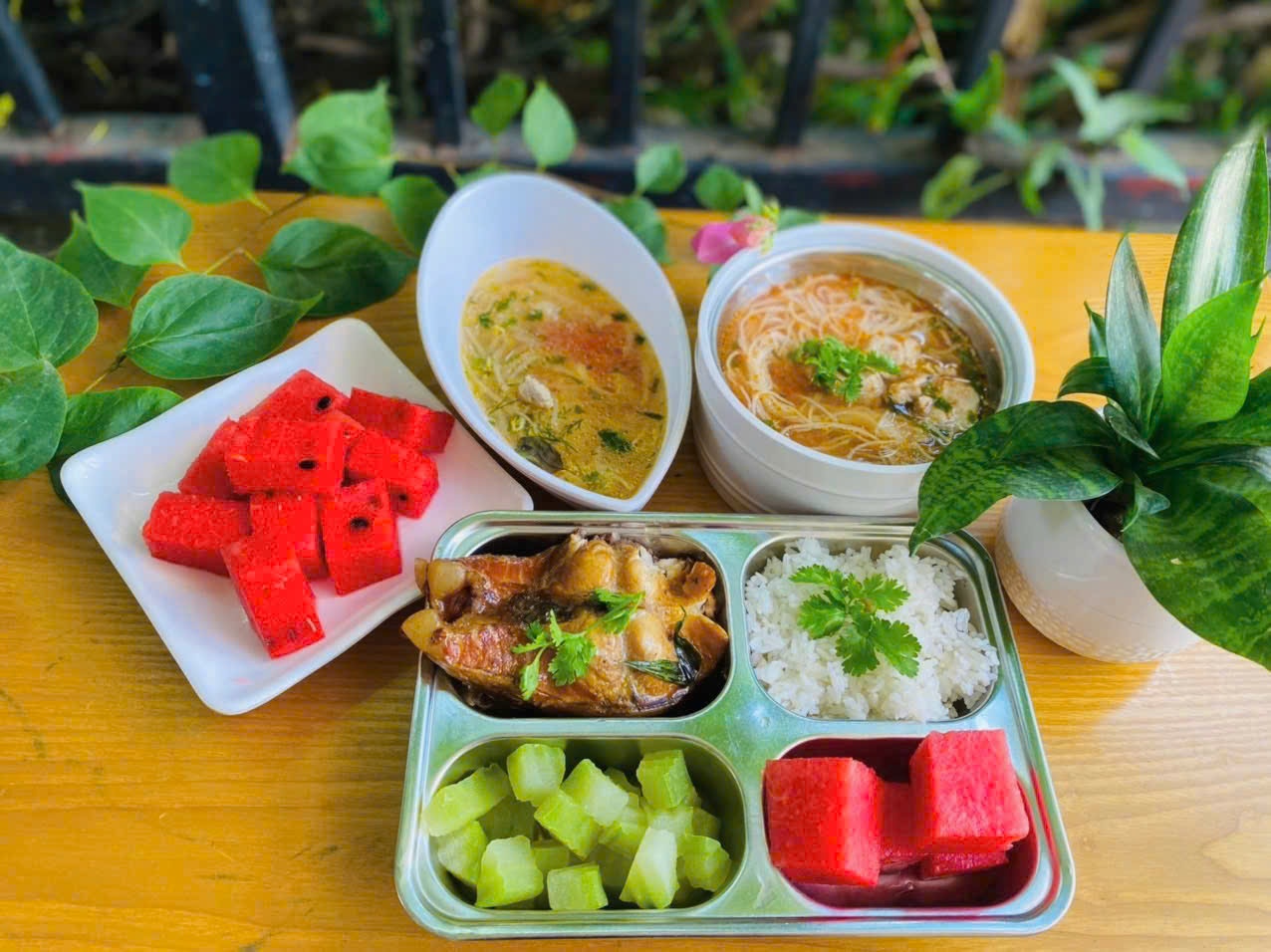 - Thực phẩm được giao đến và sử dụng hết trong ngày, có lưu mẫu thức ăn từng bữa và dùng sữa hạt, nước hoa quả bếp tự làm thay cho sữa bò siêu thị.