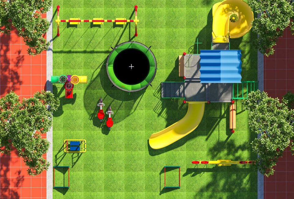 - Cầu trượt, xích đu, bóng rổ, bóng đá, bạt nhún, bập bênh, xe thăng bằng