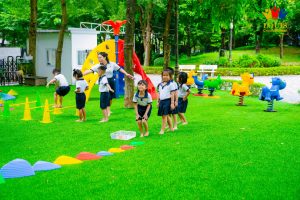 - Trường trang bị hệ thống sân chơi trải thảm cỏ và lắp đặt các trò chơi vận động giúp bé có những hoạt động ngoài trời thú vị và bổ ích. Tại đây, các con cũng thường xuyên được tham gia các buổi học ngoài trời, giúp phát triển đồng đều cả về tư duy, nhận thức và thể chất.