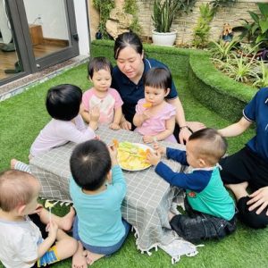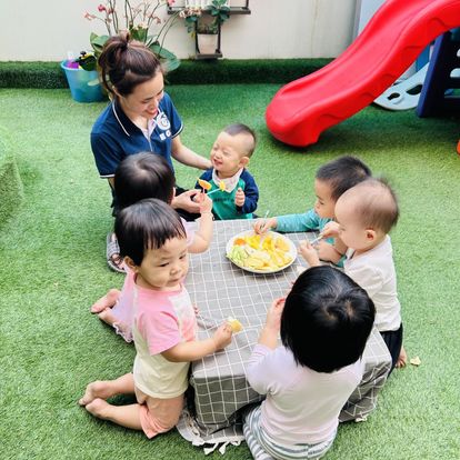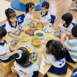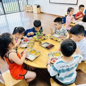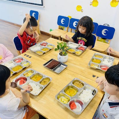 Các bé ăn tại trường 5 bữa: 3 chính và 2 bữa phụ.Mỗi tháng, các bé còn có cơ hội tham gia tiệc buffet, nơi bé được tự do lựa chọn thực phẩm và trải nghiệm kỹ năng tự phục vụ.