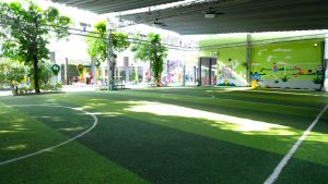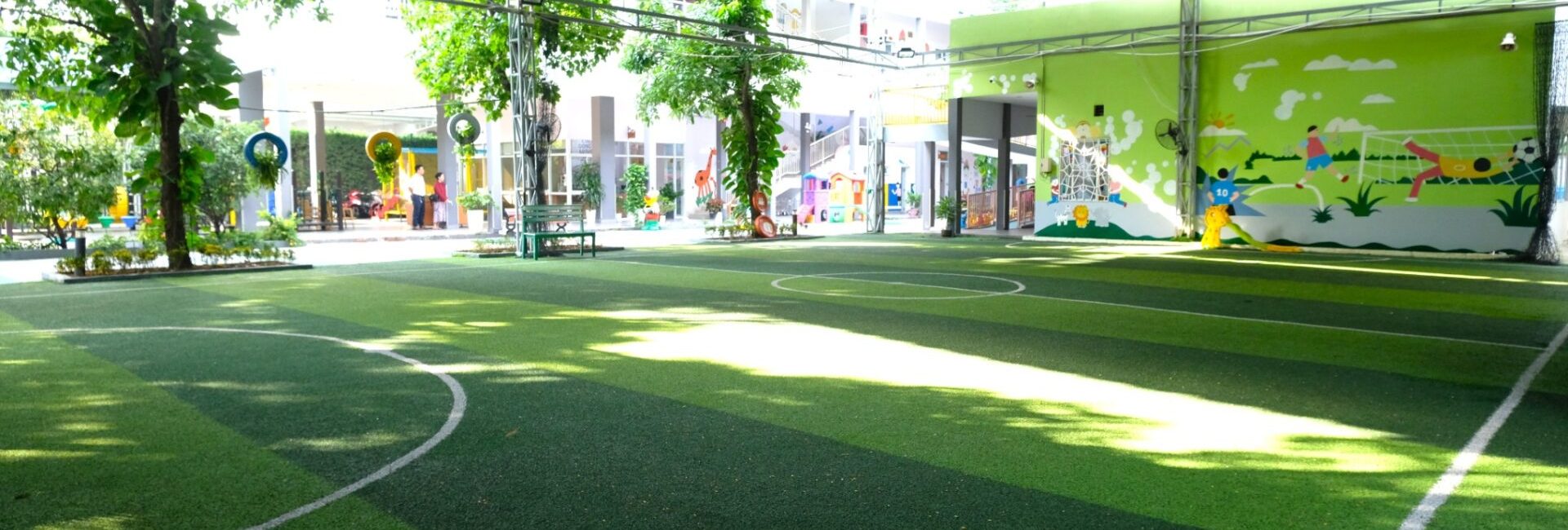 - 6 sân chơi ngoài trời chiếm 2/3 diện tích nhà trường, bao gồm sân bóng, sân chơi vận động liên hoàn, sân chơi cát.