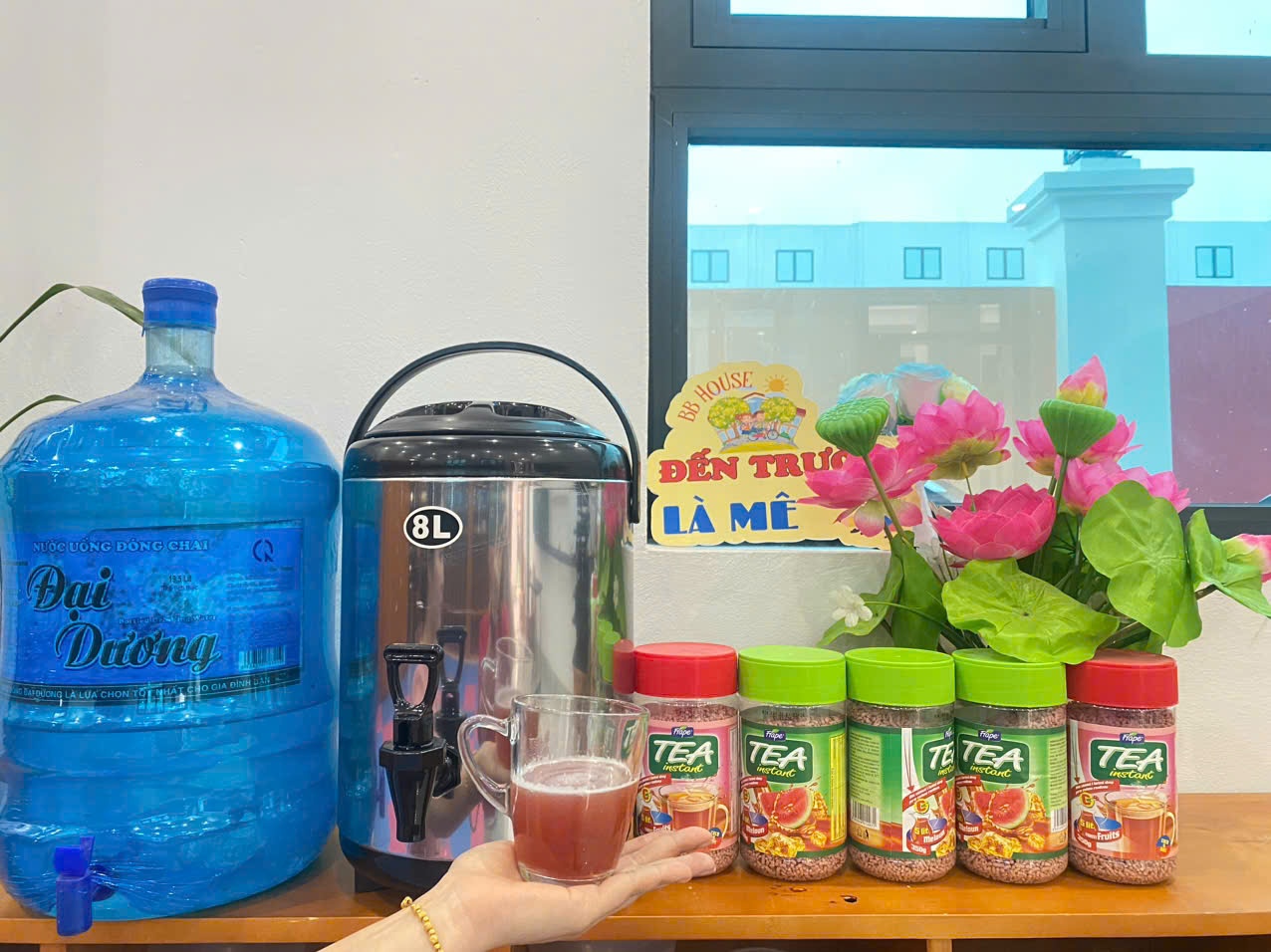 Ngoài ra, Mầm Non Song Ngữ BB House đã đưa vào thực đơn nước uống hàng ngày trà hoa quả vitamin nhập khẩu từ Tây Âu, kết hợp cùng nước ion kiềm RO. Sự kết hợp này hỗ trợ trẻ bổ sung vitamin và khoáng chất cần thiết, đồng thời hỗ trợ cân bằng cơ thể, tăng cường đề kháng và thúc đẩy quá trình trao đổi chất. Tại BB House, từng bữa ăn vừa là sự chăm sóc vừa là tình yêu thương, là sự tận tâm nuôi dưỡng những mầm non tương lai, để mỗi ngày đến trường đều là một hành trình tràn đầy niềm vui và sức sống.