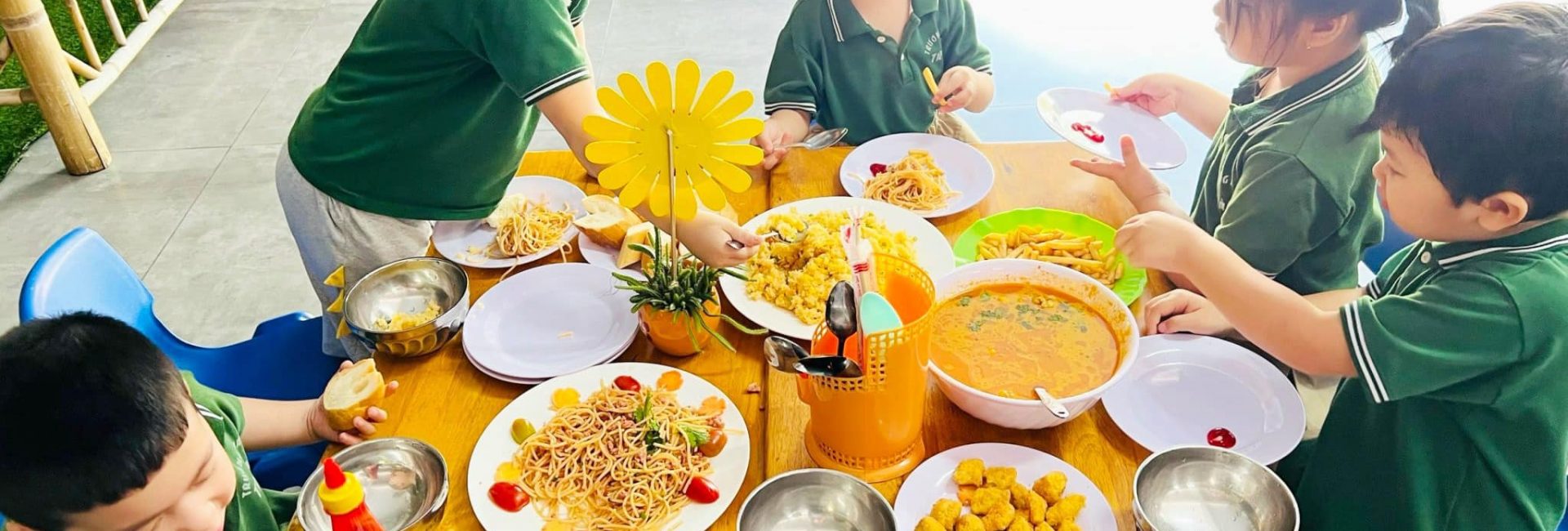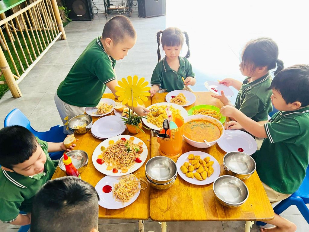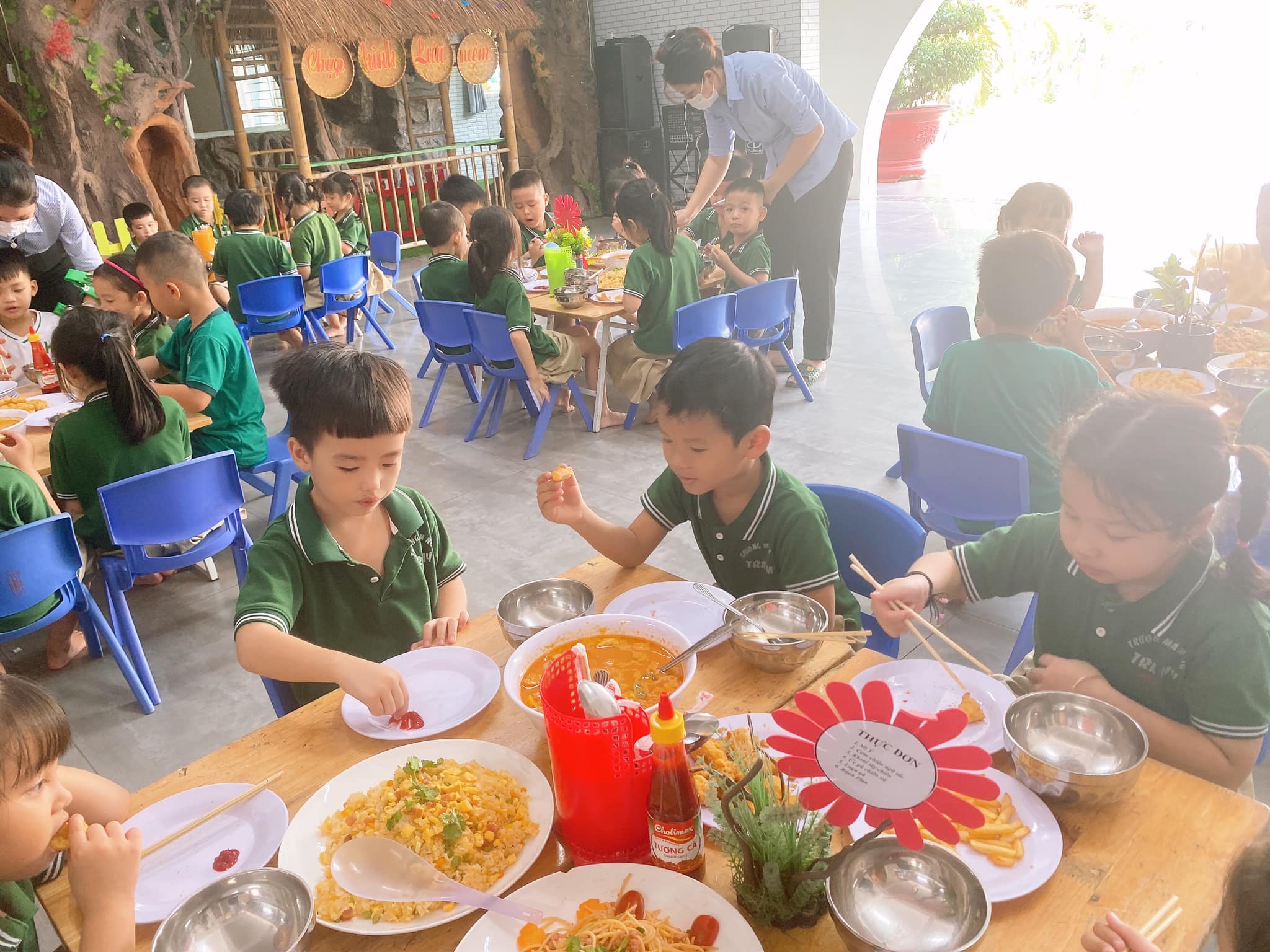 Thực đơn được thiết kế phong phú, đa dạng, và thay đổi theo ngày để đảm bảo rằng trẻ nhận được đủ lượng chất dinh dưỡng từ nhiều nguồn thức ăn khác nhau. Các bữa ăn không chỉ tập trung vào việc cung cấp năng lượng mà còn chú trọng đến sự đa dạng về loại thực phẩm, từ rau củ, đạm, tinh bột đến các loại hoa quả. Điều này giúp phát triển cảm giác thị giác và vị giác của trẻ, khuyến khích sự quan tâm và ưa thích đối với nhiều loại thực phẩm khác nhau.