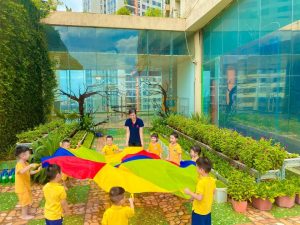 Trang bị đầy đủ camera, sân chơi trong nhà, thư viện, sân chơi ngoài trời.