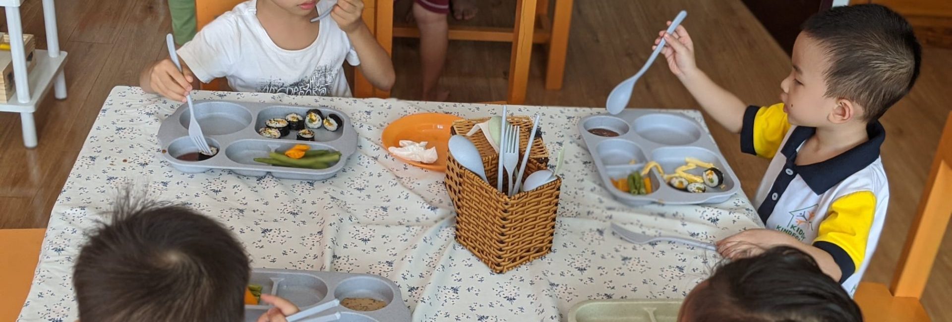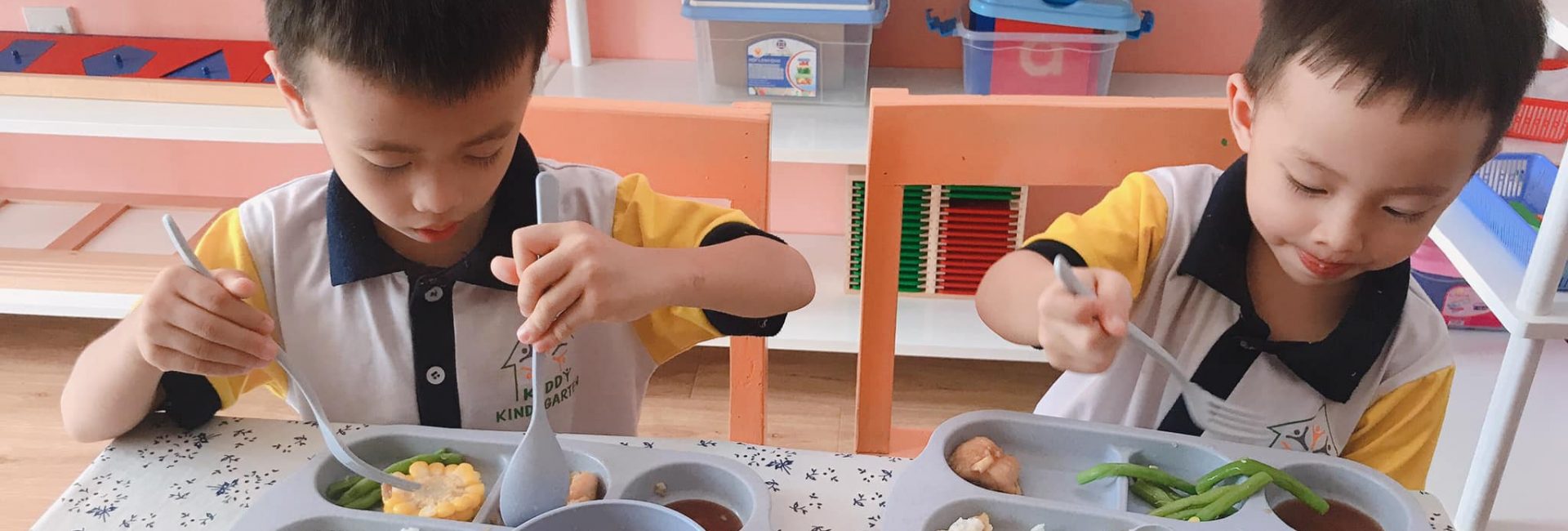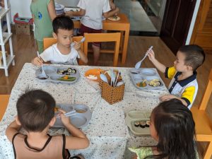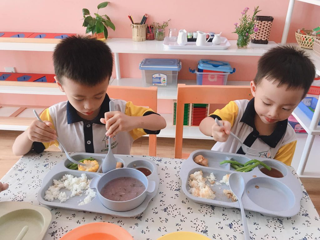 Nhà trường luôn hiểu rằng một chế độ dinh dưỡng cân bằng tạo nên một cơ thể khỏe mạnh. Một số loại rau được trồng theo tiêu chuẩn sạch tuyệt đối, bổ sung thêm vào bữa ăn cho trẻ, cùng trẻ trải nghiệm những lần thu hoạch. Ngoài ra, để kích thích trẻ ăn ngon miệng mỗi ngày, mỗi bữa cơm là 1 sản phẩm tạo hình đặc sắc, khiến các bạn nhỏ có thể tự giác ngồi vào bàn và ăn một cách ngon miệng và vui vẻ. Mỗi tháng, trẻ sẽ đi ăn Buffet để tăng tính đa dạng và kích thích nhu cầu lựa chọn món ăn theo ý trẻ. Trẻ có thể tăng cân nhẹ nhàng và chậm rãi, nhưng trẻ luôn thấy khỏe khoắn và tràn đầy năng lượng mỗi ngày.