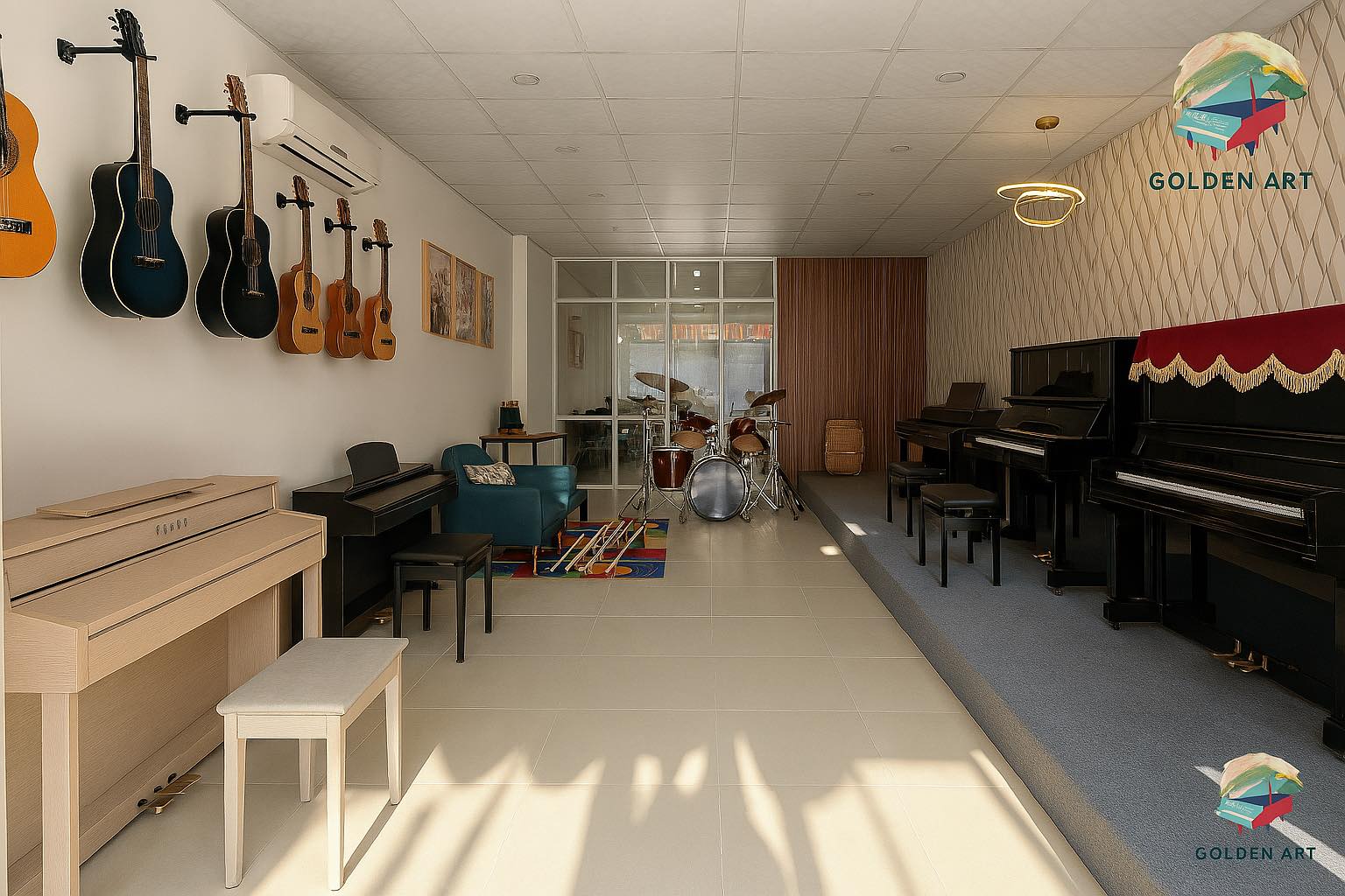 Trung tâm Nghệ thuật Golden Art sở hữu không gian học tập chuyên nghiệp, sáng tạo và đầy cảm hứng. Các phòng học được cách âm đạt chuẩn, trang bị đầy đủ piano, guitar, trống, micro, loa, máy chiếu cùng ánh sáng và nhiệt độ được điều chỉnh phù hợp cho từng lớp học.