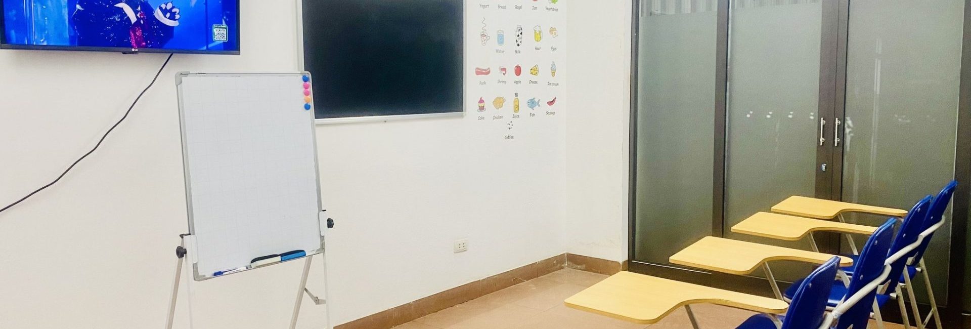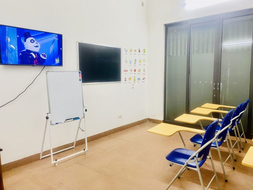 - Trung tâm có các phòng học rộng rãi, diện tích khoảng 20m2, với đầy đủ tiện nghi như bảng, bàn ghế, TV. Mỗi phòng học được thiết kế thoáng đãng và ánh sáng tự nhiên, tạo điều kiện thuận lợi cho quá trình học tập.