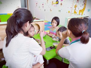 - Với nhóm nhà trẻ, thời gian đầu đi học, giáo viên sẽ giúp đỡ và hỗ trợ cho bé trong các bữa ăn tại trường.