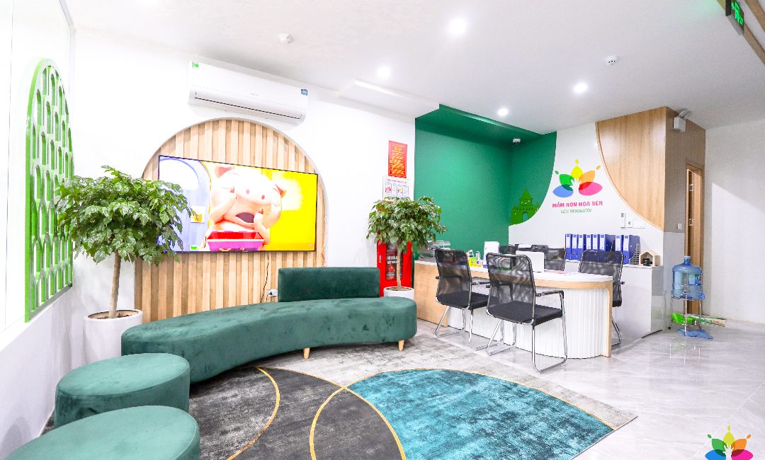 Trường Mầm non Hoa Sen (Lotus Kindergarten) được trang bị đầy đủ các trang thiết bị hiện đại: tivi màn hình lớn, máy lọc không khí, máy hút ẩm, hệ thống cấp gió tươi đảo hút 2 chiều cùng học cụ nhập khẩu hoàn toàn từ Hàn Quốc.