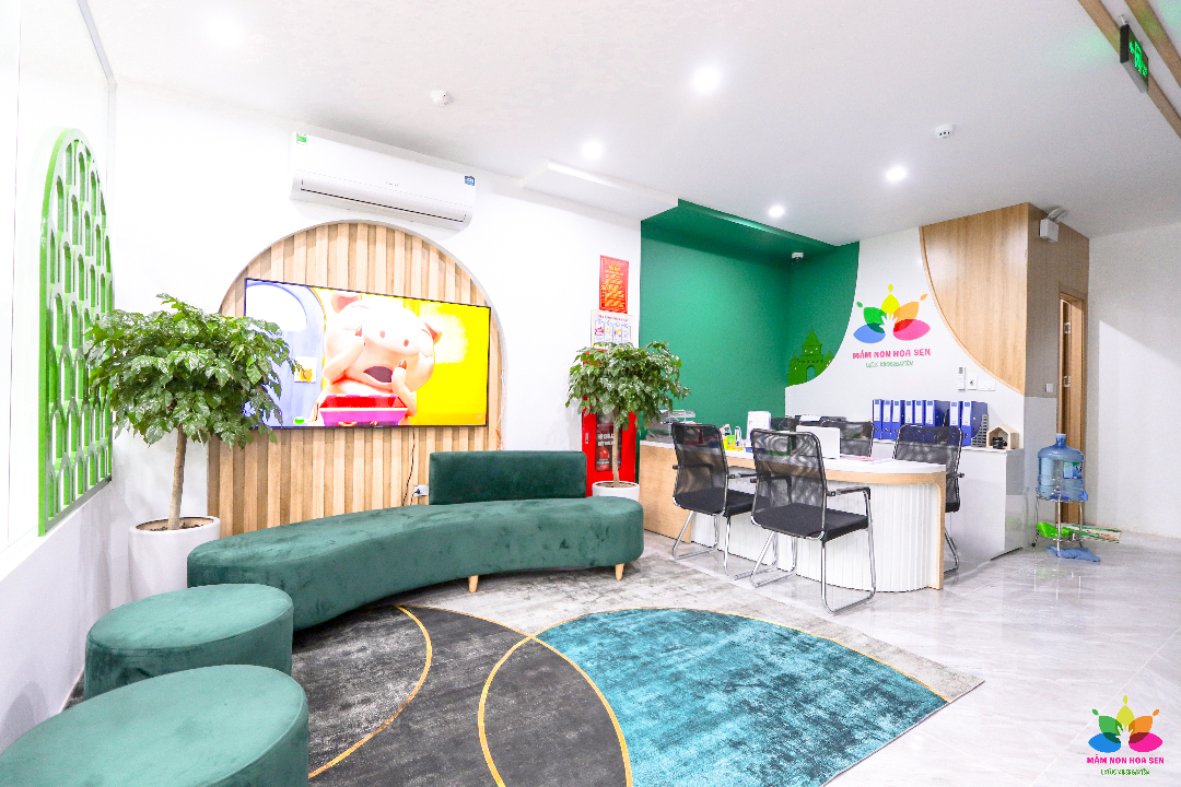 Trường Mầm non Hoa Sen (Lotus Kindergarten) được trang bị đầy đủ các trang thiết bị hiện đại: tivi màn hình lớn, máy lọc không khí, máy hút ẩm, hệ thống cấp gió tươi đảo hút 2 chiều cùng học cụ nhập khẩu hoàn toàn từ Hàn Quốc.
