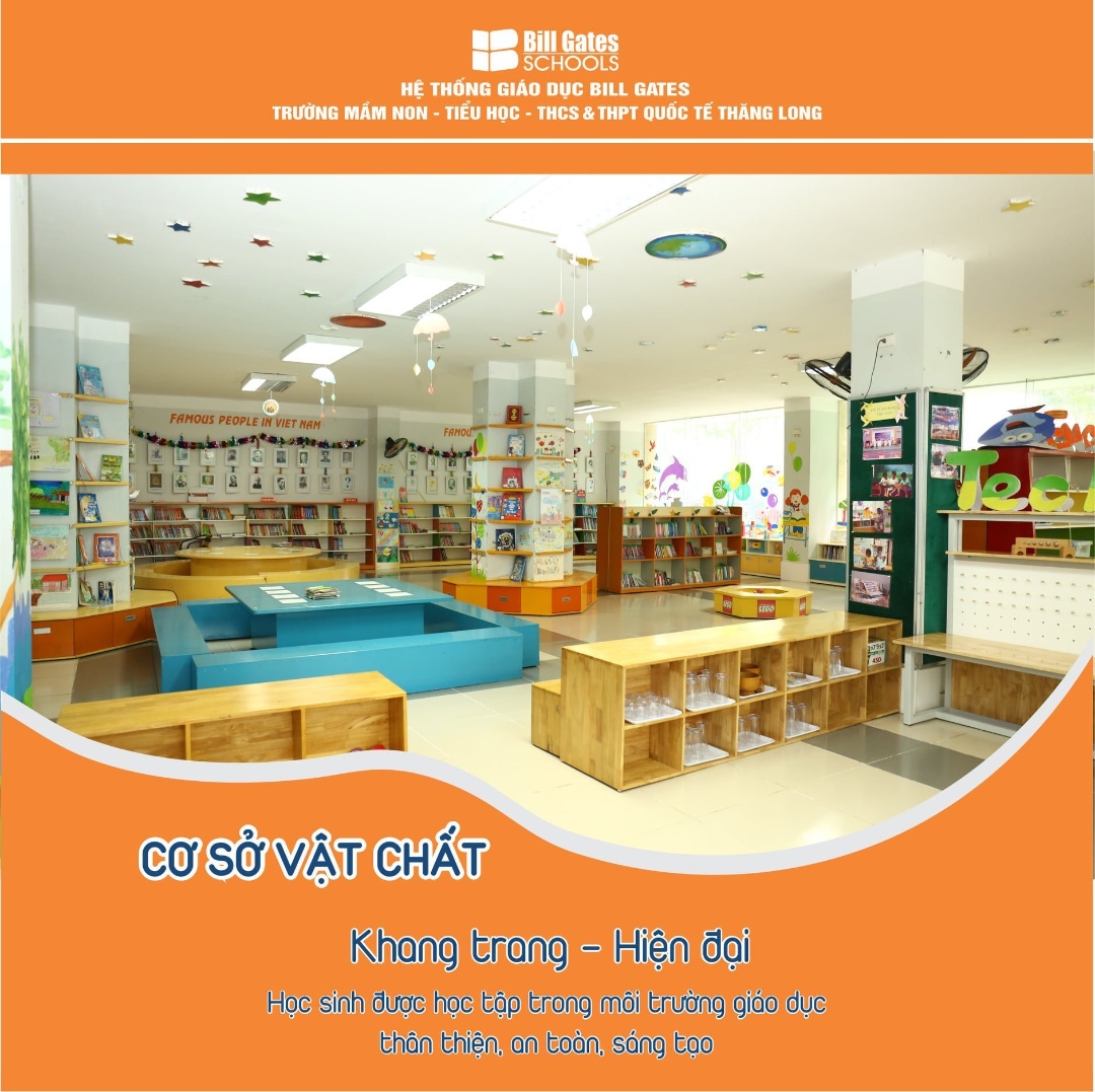 Hệ thống cơ sở vật chất của Bill Gates Schools được thiết kế và xây dựng theo các tiêu chuẩn nghiêm ngặt trong nước và quốc tế, đảm bảo tối đa các quy định về an toàn, vệ sinh, phòng cháy chữa cháy, điều kiện thông thoáng, góp phần tạo ra một môi trường học tập vừa thoải mái, vừa an toàn cho học sinh. Các phòng học, nhà ăn, sân chơi, nhà vệ sinh luôn được giữ sạch và vệ sinh theo quy trình chuẩn nhằm đảm bảo một môi trường xanh, sạch, đẹp cho học sinh học tập, sinh hoạt và vui chơi sạch sẽ, an toàn nhất. Bill Gates Schools luôn cố gắng giúp học sinh phát triển toàn diện cả về kiến thức và kĩ năng. Vì vậy, hệ thống luôn không ngừng cải thiện để cung cấp chất lượng trải nghiệm giáo dục tốt nhất cho học sinh.