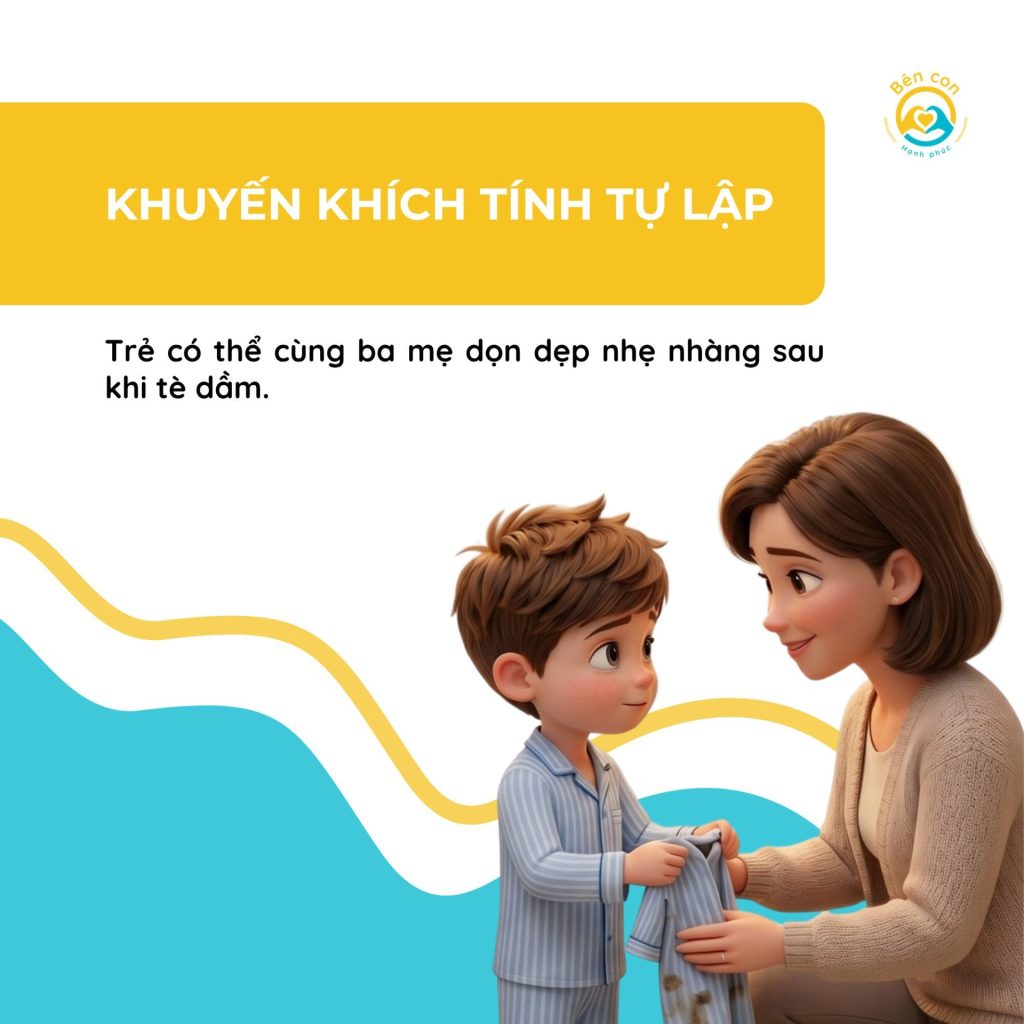 Trẻ có thể cùng ba mẹ dọn dẹp nhẹ nhàng sau khi tè dầm.